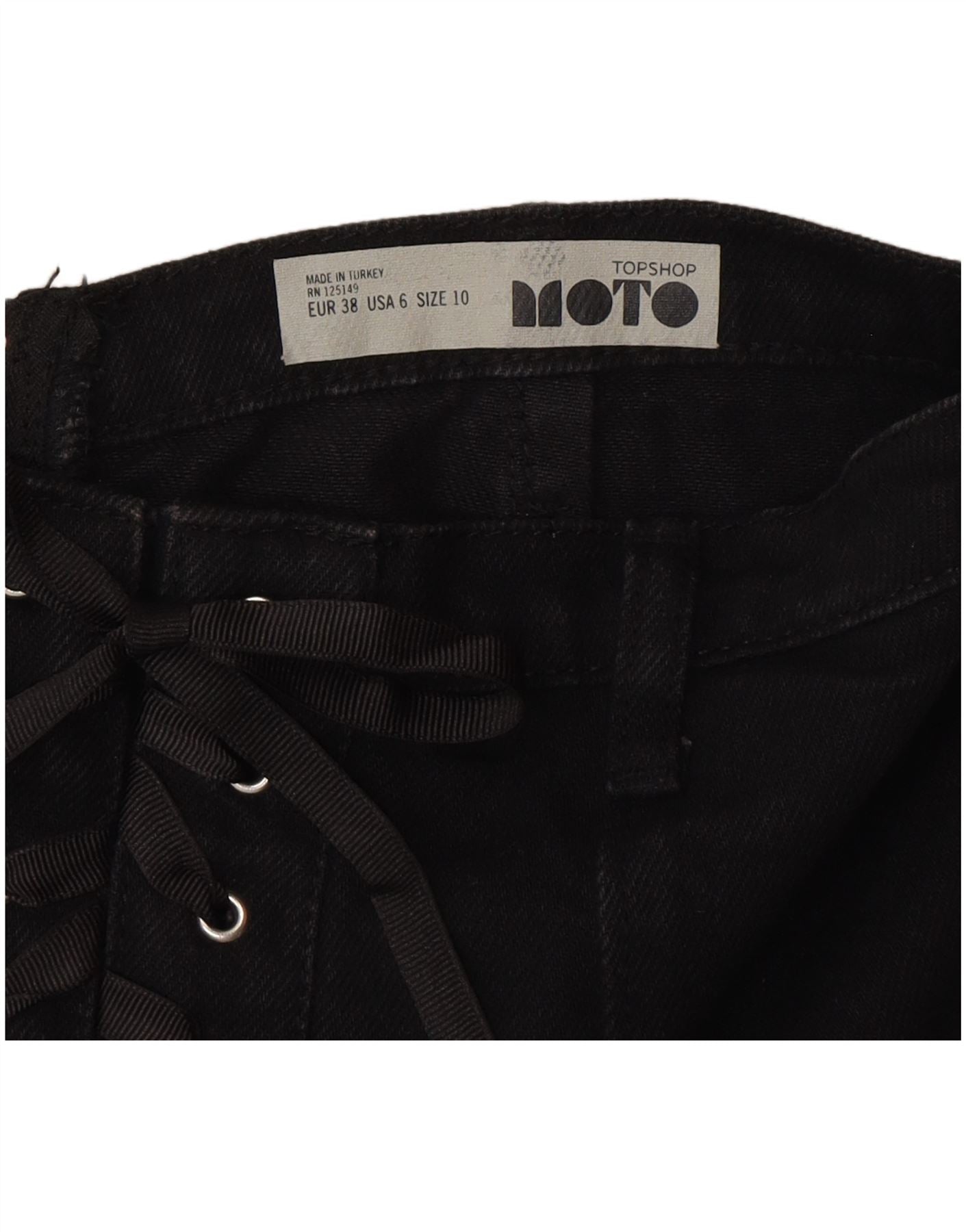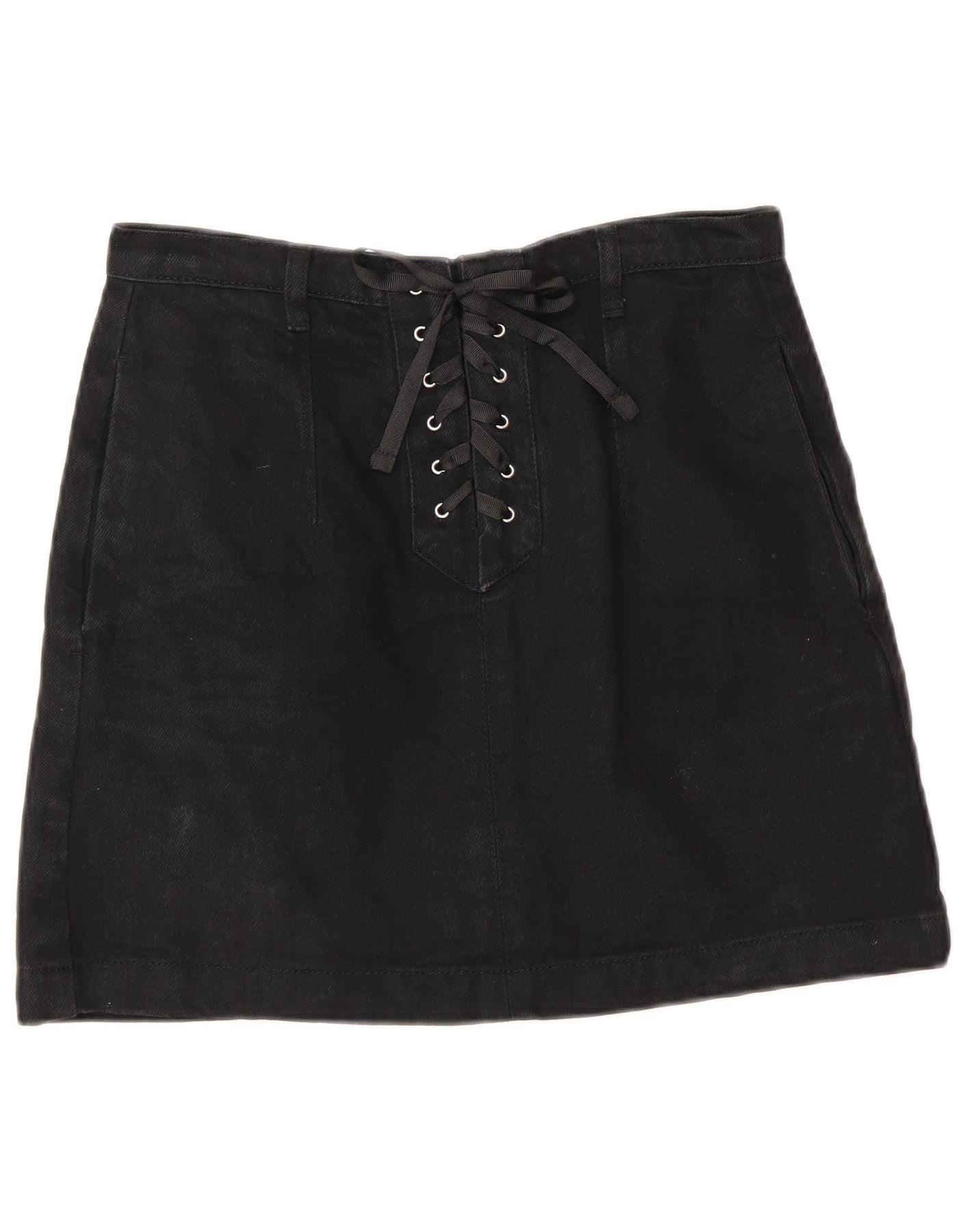 - AI Description: This Moto womens mini skirt is crafted from black denim, offering a sturdy yet stylish feel. It features a classic A-line silhouette with a regular fit. The front boasts a distinctive lace-up detail, adding a retro touch. A discreet zip closure is located at the back. Practical pockets are included for convenience, blending style with everyday utility.