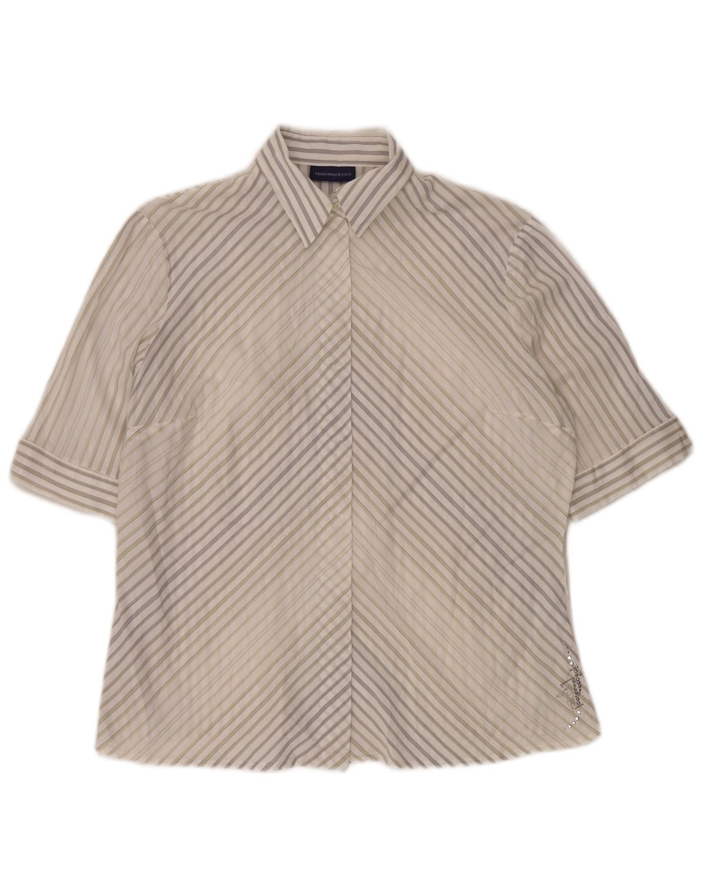 TRUSSARDI JEANS Womens Short Sleeve Shirt Blouse UK 22 3XL White Pinstripe