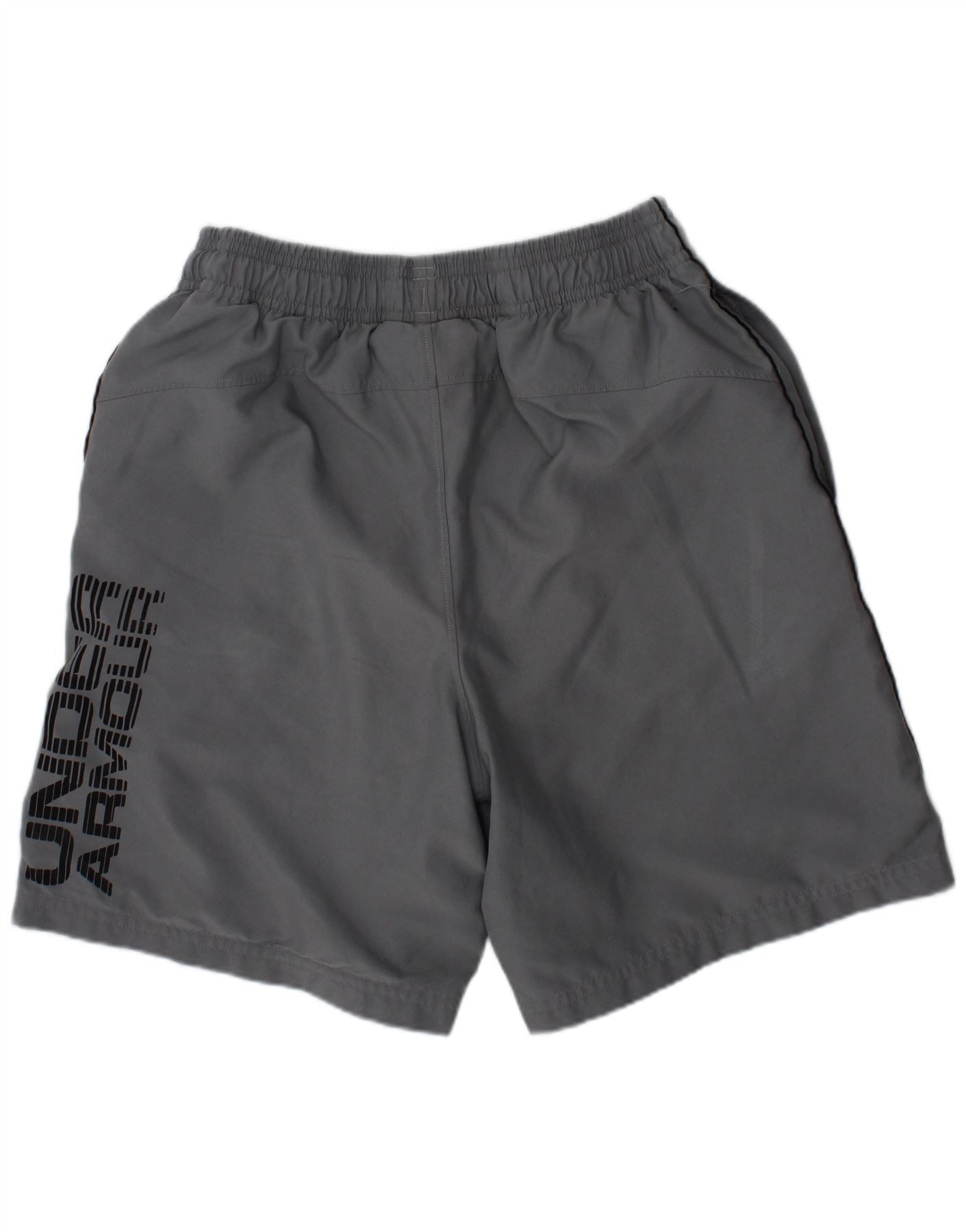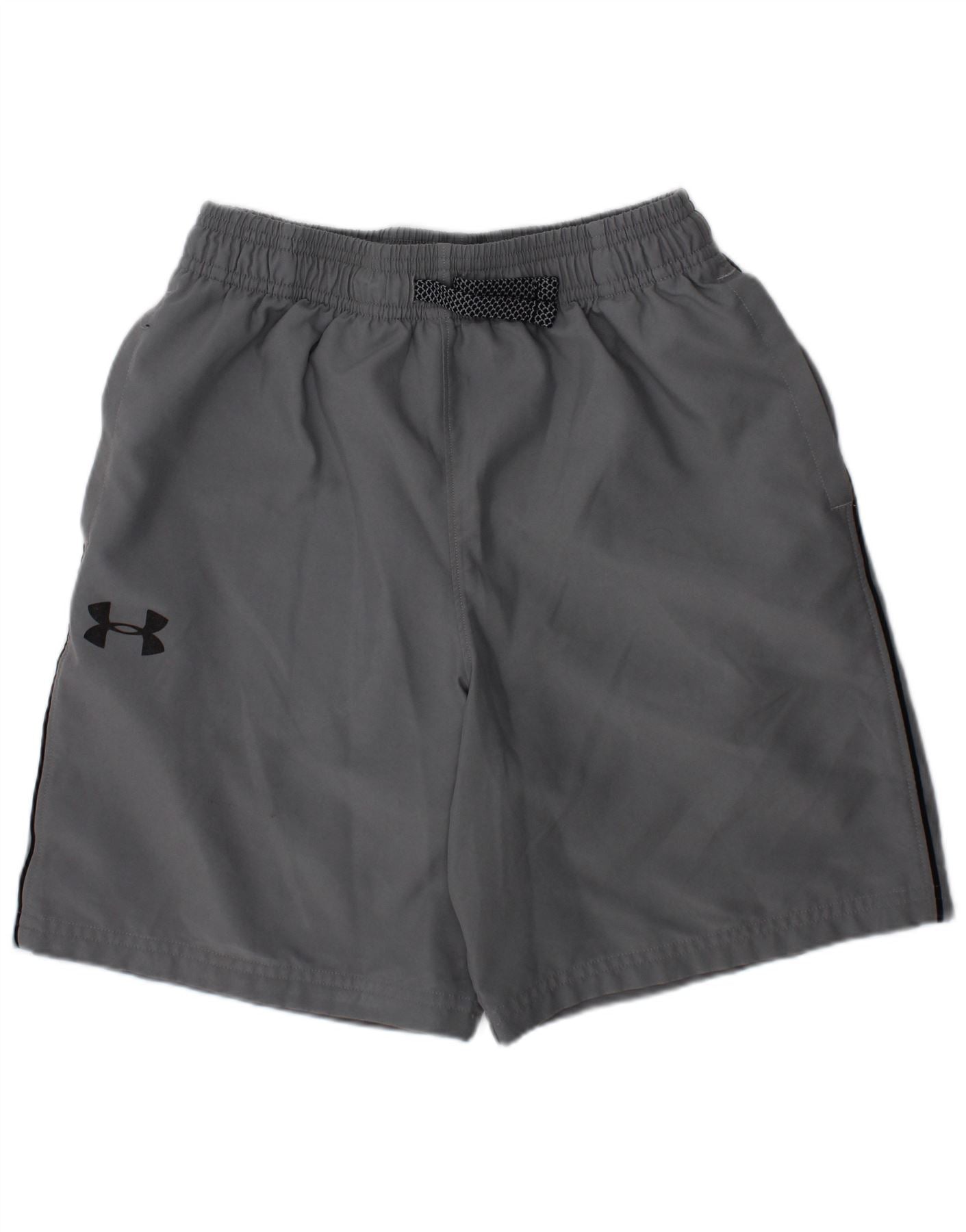 - AI Description: This Under Armour boys' shorts are crafted from a grey woven fabric, offering a breathable feel. An elasticated waistband with a drawstring closure ensures a secure, comfortable fit. The regular fit provides ease of movement for active wear. Practical side pockets are included. A prominent Under Armour logo features on the leg, enhancing the athletic style.
