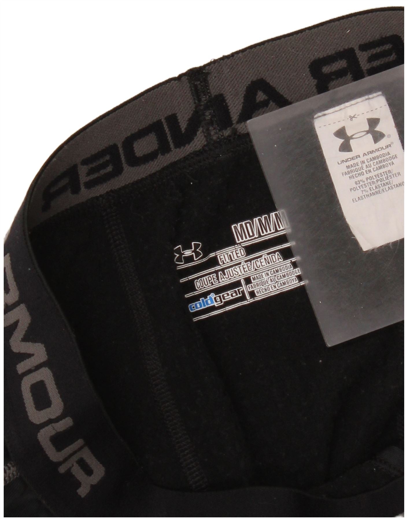 - AI Description: These Under Armour mens leggings are crafted from a black polyester elastane blend. This blended fabric offers thermal comfort and a smooth feel. They feature a slim fit with an elasticated pull-on waistband for secure wear. Contrast grey stitching highlights the athletic cut. The Under Armour logo is visible on the waistband and leg. Designed for training, these leggings provide warmth and flexibility.