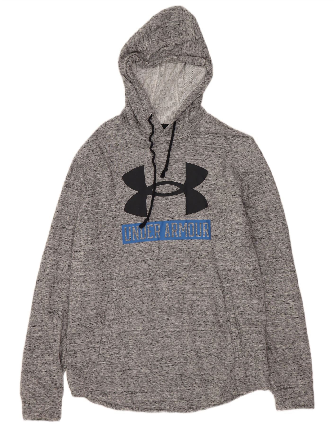 - AI Description: This Under Armour mens hoodie jumper is crafted from a comfortable grey cotton blend jersey. Its flecked pattern gives a subtle textured finish. The pullover design features a practical hood with drawstring detail. Long sleeves and a relaxed fit ensure ease of movement. A spacious front kangaroo pocket adds functionality. The prominent black and blue graphic logo on the chest provides a distinctive brand accent.