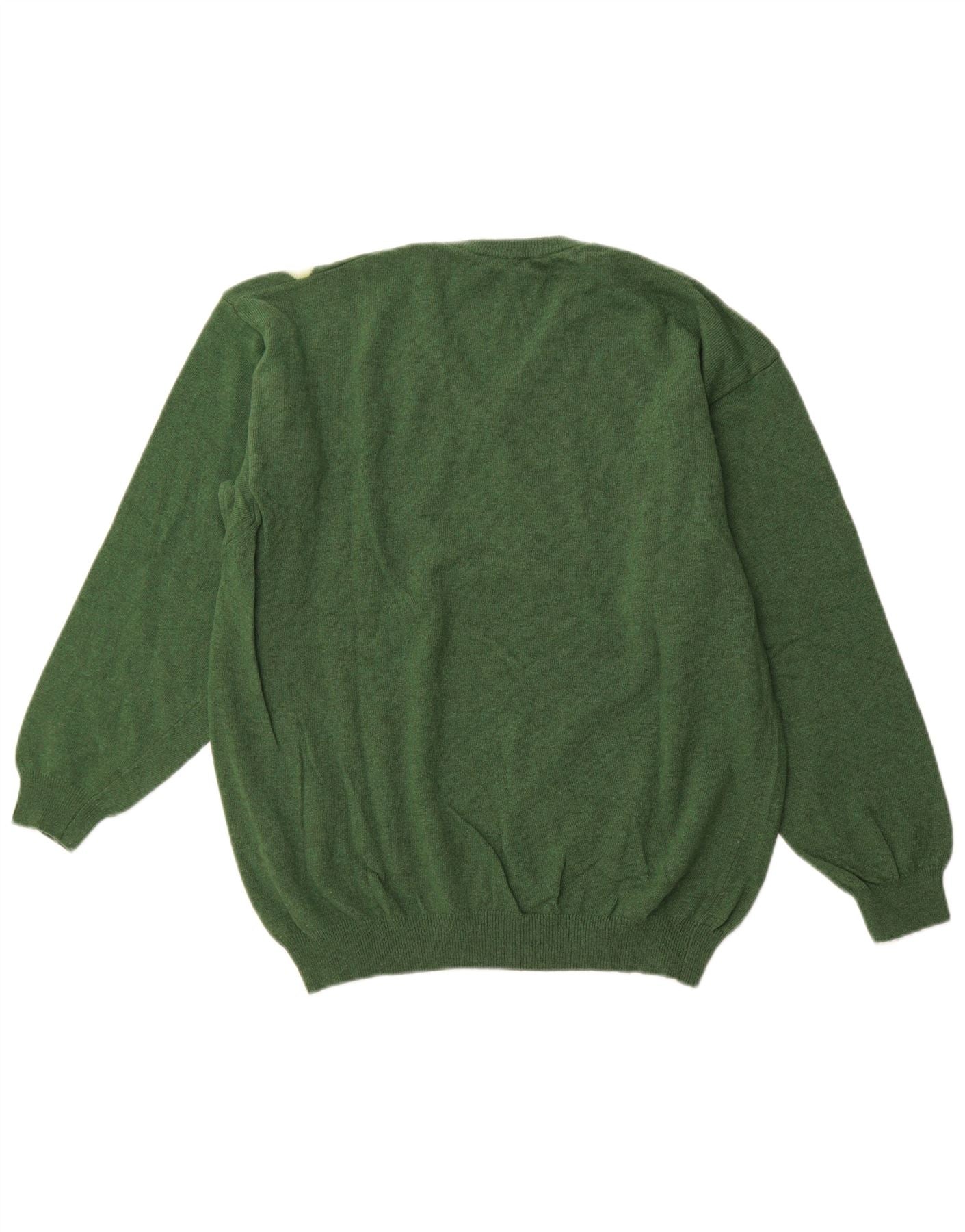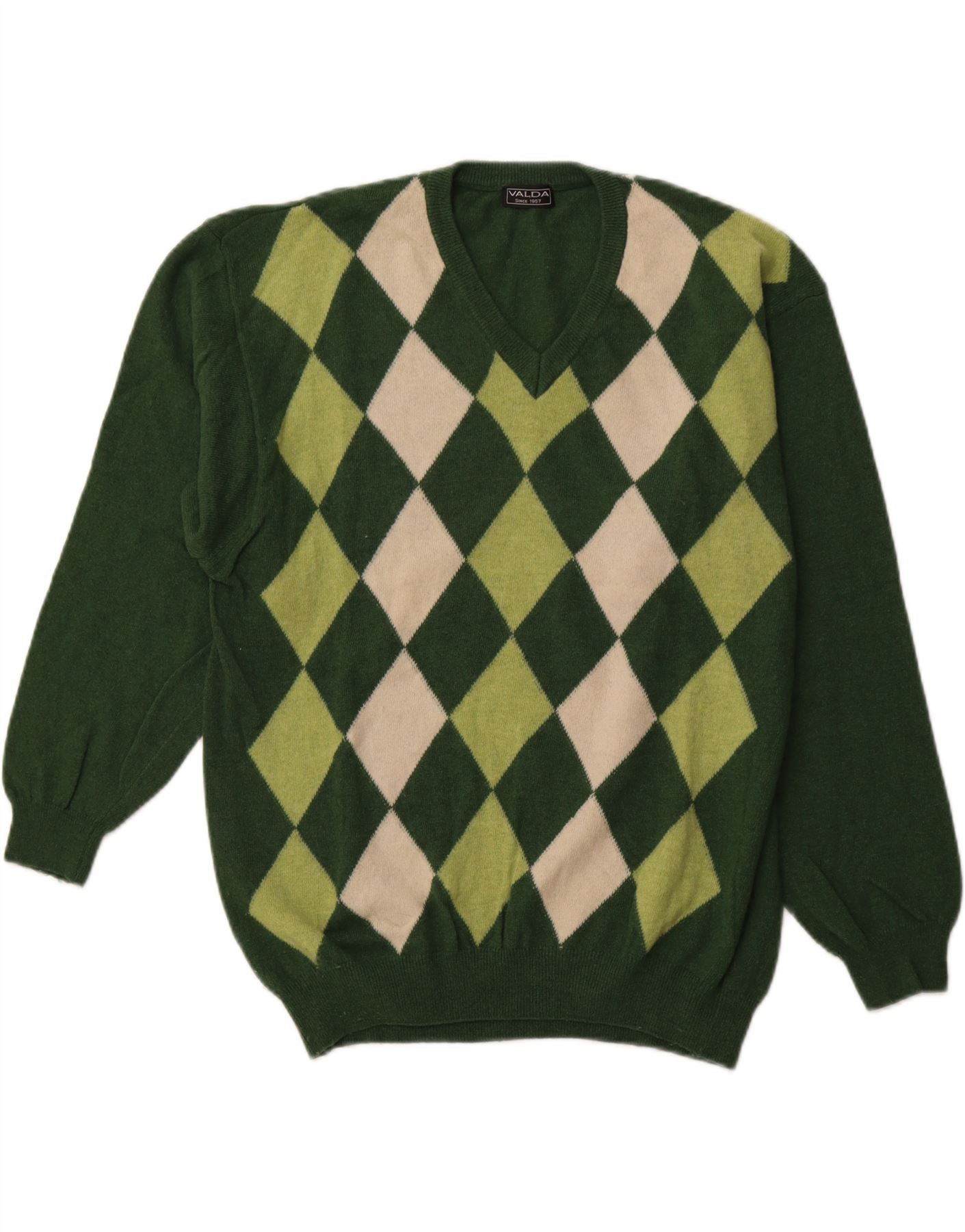 VALDA Mens V-Neck Jumper Sweater Large Green Argyle/Diamond Wool