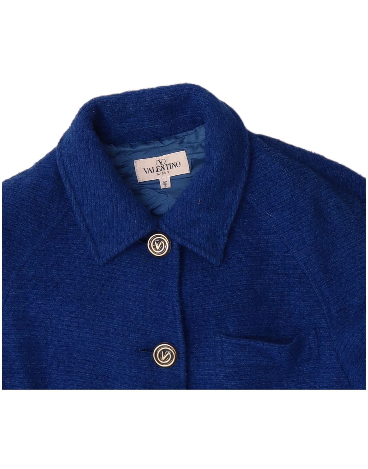 - AI Description: This Valentino womens double-breasted coat is crafted from luxurious blue wool tweed, offering a rich texture and warmth. It features a classic collared neckline and a relaxed fit for comfortable wear. The 3/4 length sleeves add a contemporary touch. A four-button closure and functional pockets provide practical and stylish accents, enhancing its sophisticated silhouette.