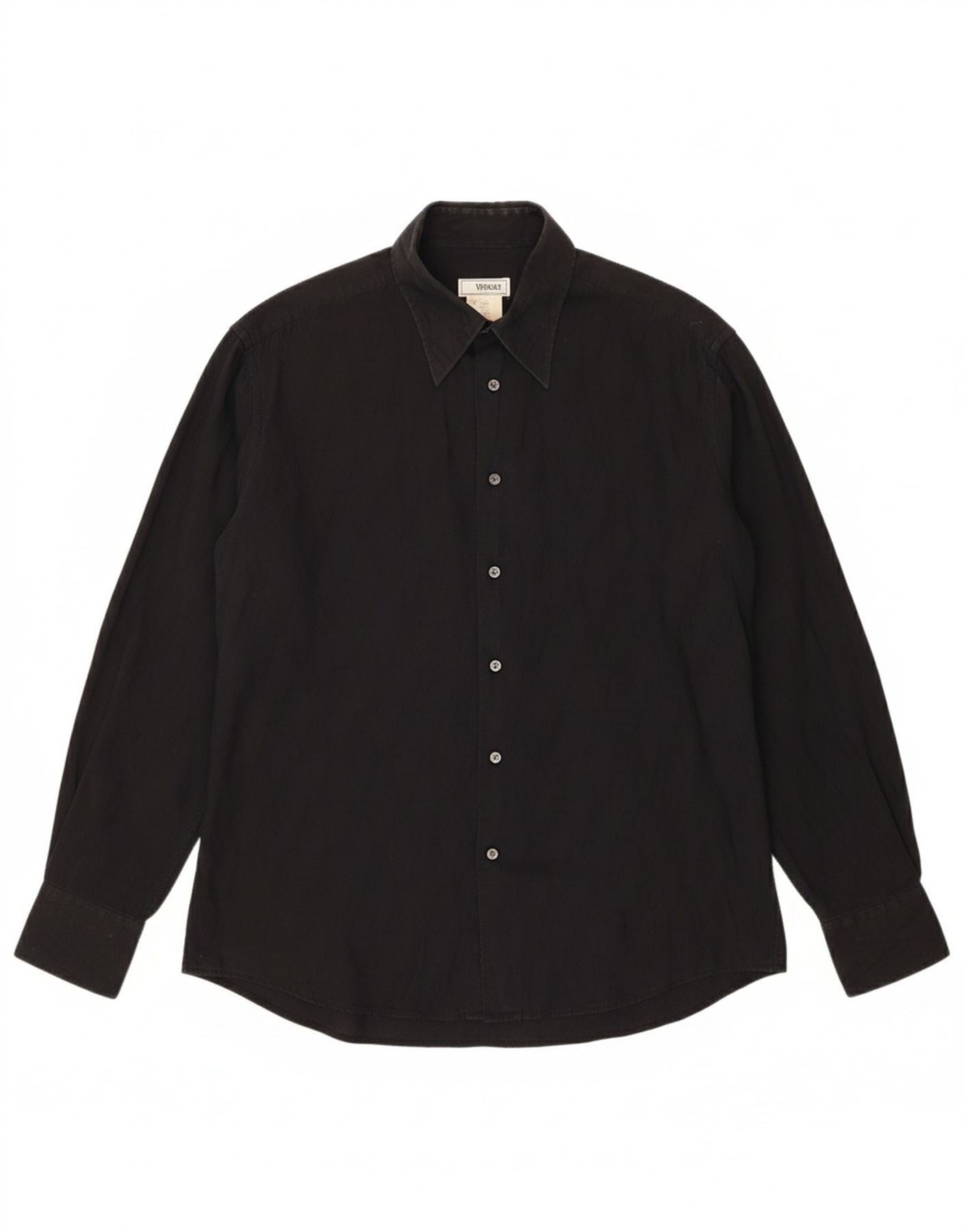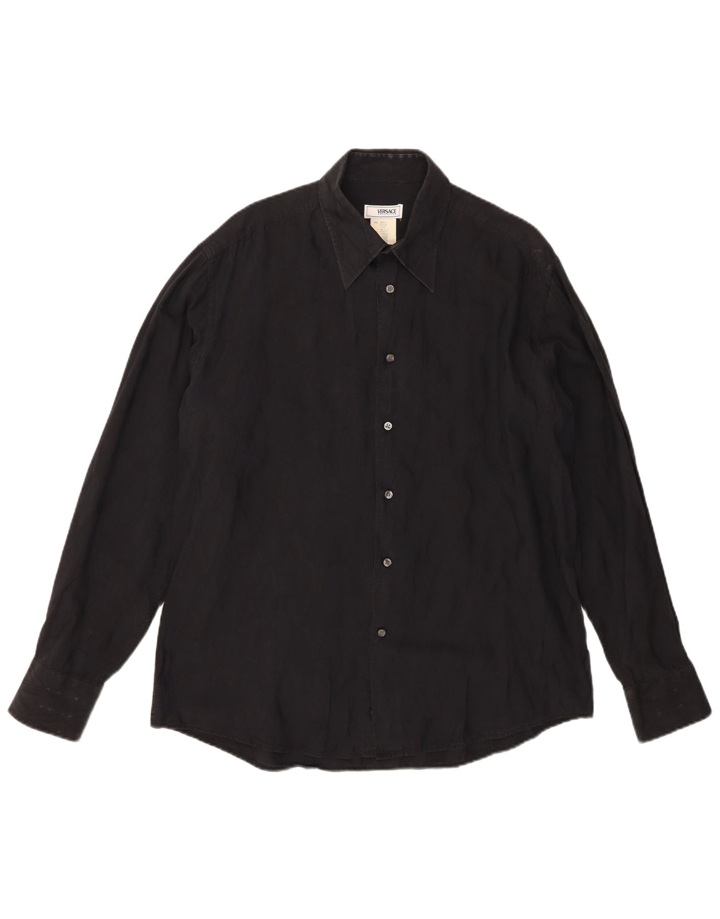 - AI Description: This Versace mens shirt is crafted from a comfortable black cotton and viscose blend. The collared neckline and full button-up front offer a classic, refined look. Long sleeves finish with neat cuffs, enhancing the structured silhouette. A regular fit ensures ease of movement and timeless appeal. Subtle pockets add practical detail to this versatile garment.