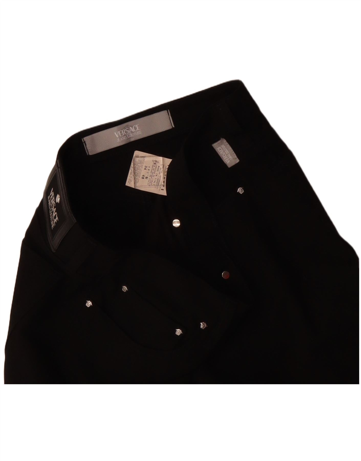 - AI Description: These Versace mens straight jeans are crafted from black denim, a blend of 98 percent cotton and 2 percent elastane. This offers a comfortable feel with a slight stretch. They feature a classic straight leg and a regular fit for timeless appeal. The button closure ensures a secure fastening. Practical pockets are included, and a subtle logo accent adds a signature touch. The overall style is classic and versatile.