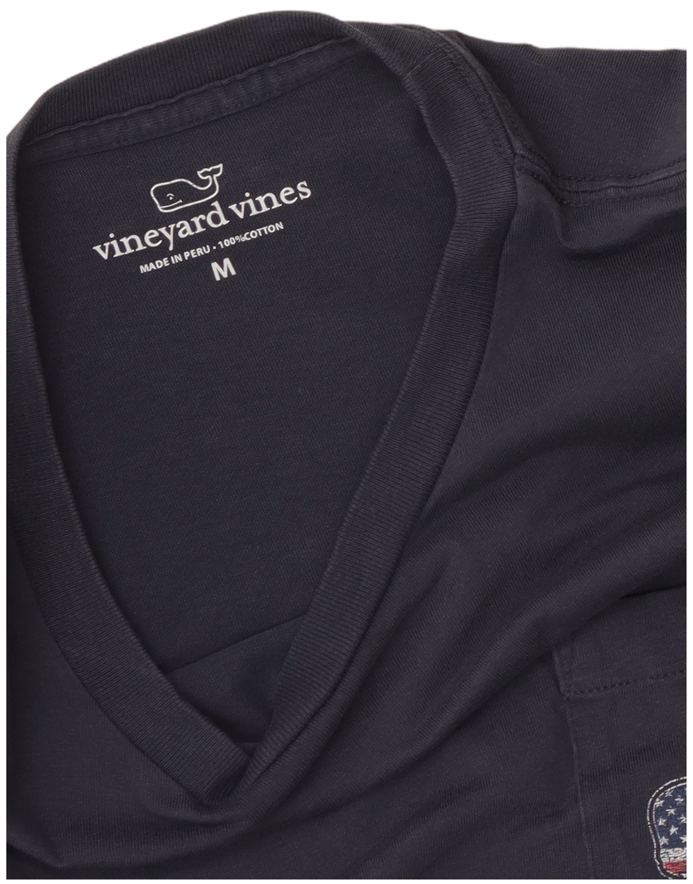 - AI Description: This Vineyard Vines mens graphic T-shirt is crafted from soft navy blue cotton jersey. It features a classic round neck and short sleeves. A chest pocket displays an embroidered whale logo with a US flag pattern. The pullover style offers a comfortable regular fit. This nautical-inspired top combines casual comfort with distinctive branding.