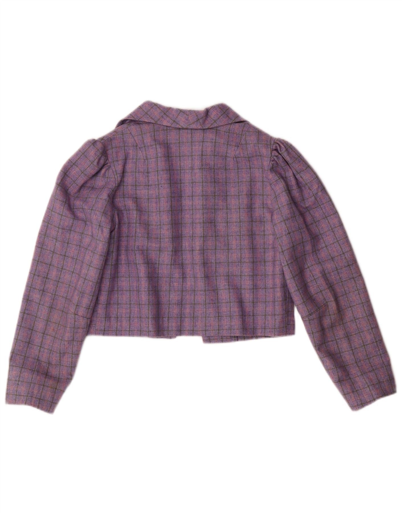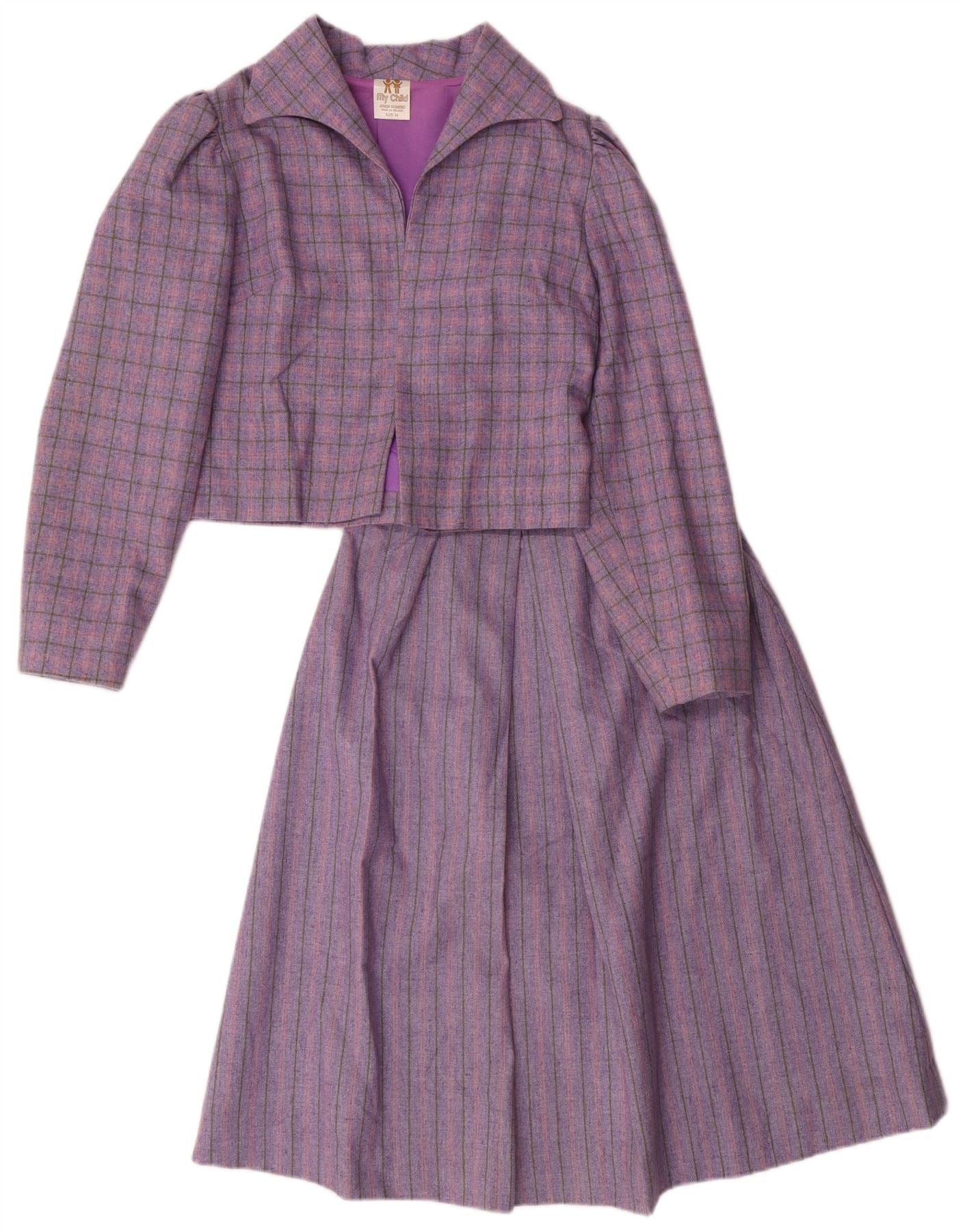 - AI Description: This Vintage girls' 2 Piece Skirt Set features a purple plaid tweed in a regular fit. Crafted in Ireland from 50% polyester and 48% wool, the set includes a collared, long-sleeve jacket with a button closure and shoulder pads. The lined skirt completes the classic look. The plaid pattern adds a touch of timeless style.
