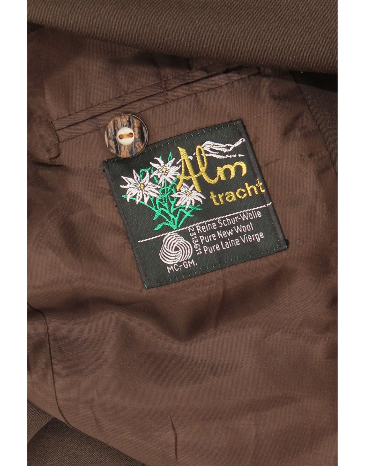 - AI Description: This Vintage mens brown suit jacket is crafted from pure new wool, offering a refined woven texture. It features a distinctive stand-up collared neckline and a three-button front closure. Long sleeves and a classic fit ensure a smart silhouette. Subtle pockets add practical detail. The ethnic Alm tracht style gives it a unique, traditional appeal.