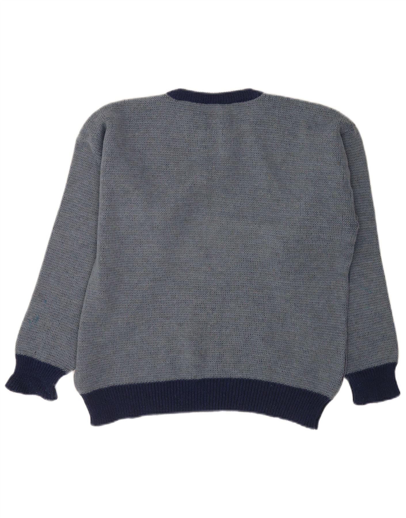 - AI Description: This Vintage mens Crew Neck Jumper Sweater is crafted from a comfortable knit fabric. It features a grey base with a bold geometric pattern in blue, navy, and deep red tones. The classic round neck and long sleeves offer a timeless silhouette. Cuffed sleeves and hem ensure a neat finish. This pullover style provides a regular fit for everyday comfort.