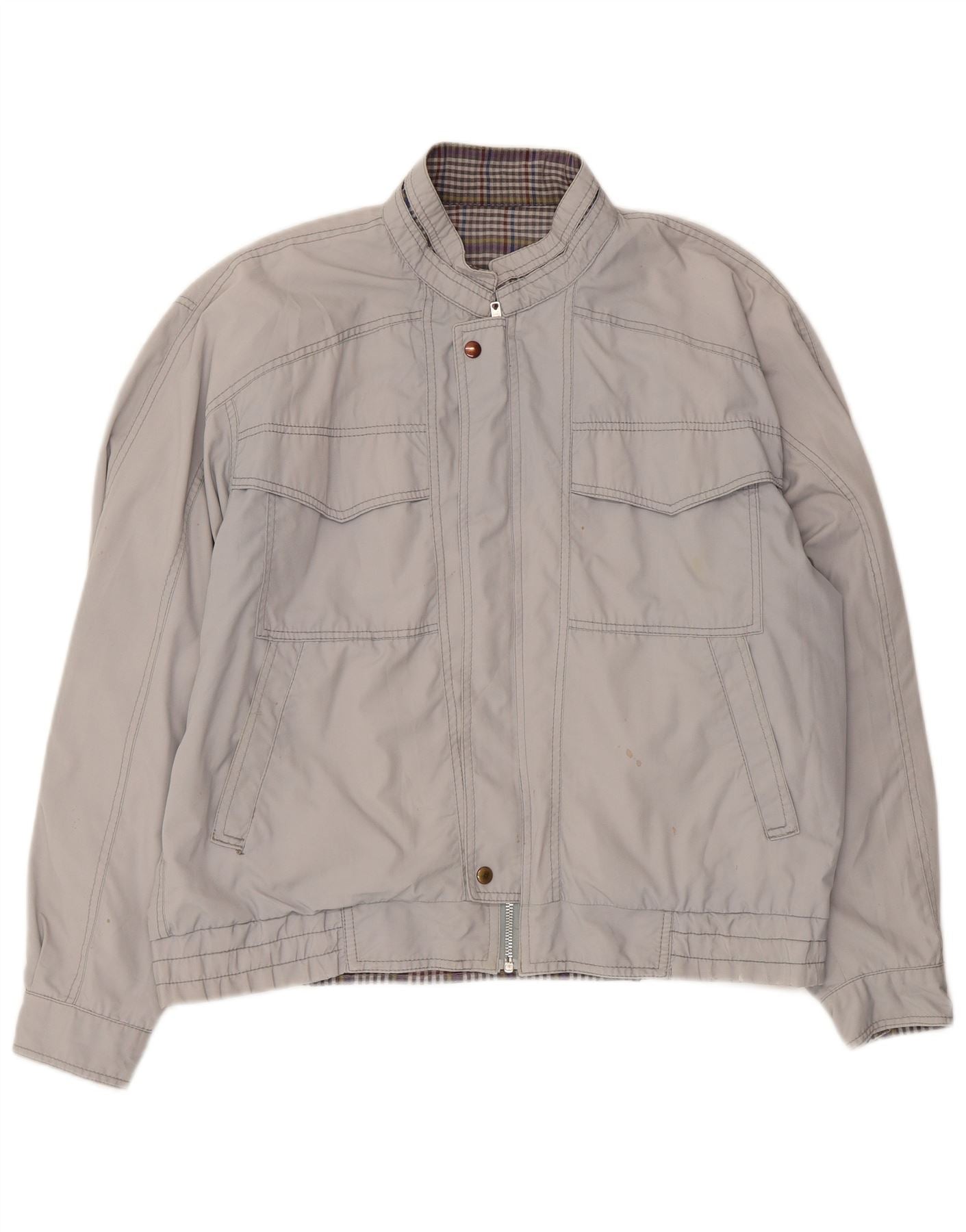 - AI Description: This Vintage mens Bomber Jacket is crafted from a grey woven fabric, offering a smooth yet durable feel. It features a classic collared neckline and long sleeves with cuffed details. The full zip closure ensures a secure fit. A regular fit provides comfortable wear. Front pockets with button accents add practical style. The jacket is reversible, revealing a subtle check pattern on the interior.