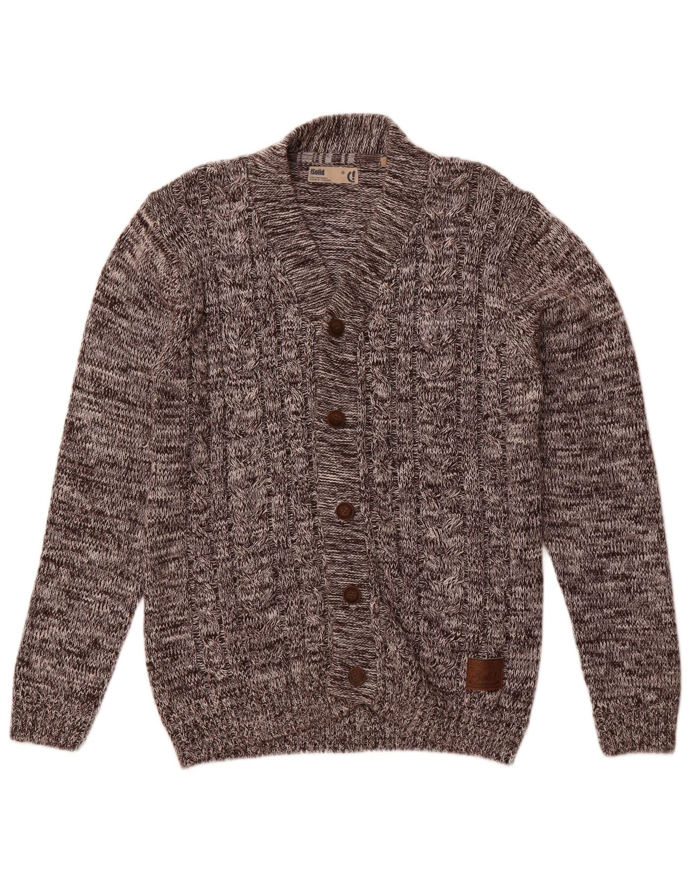 - AI Description: This Solid mens Cardigan Sweater is crafted from 100 percent BCI Cotton knit. It features a flecked multicoloured pattern with a classic shawl neck and long sleeves. The button-up front leads to a regular fit. Practical pockets are included. The button closure adds a refined accent. This classic style offers warmth and comfort.