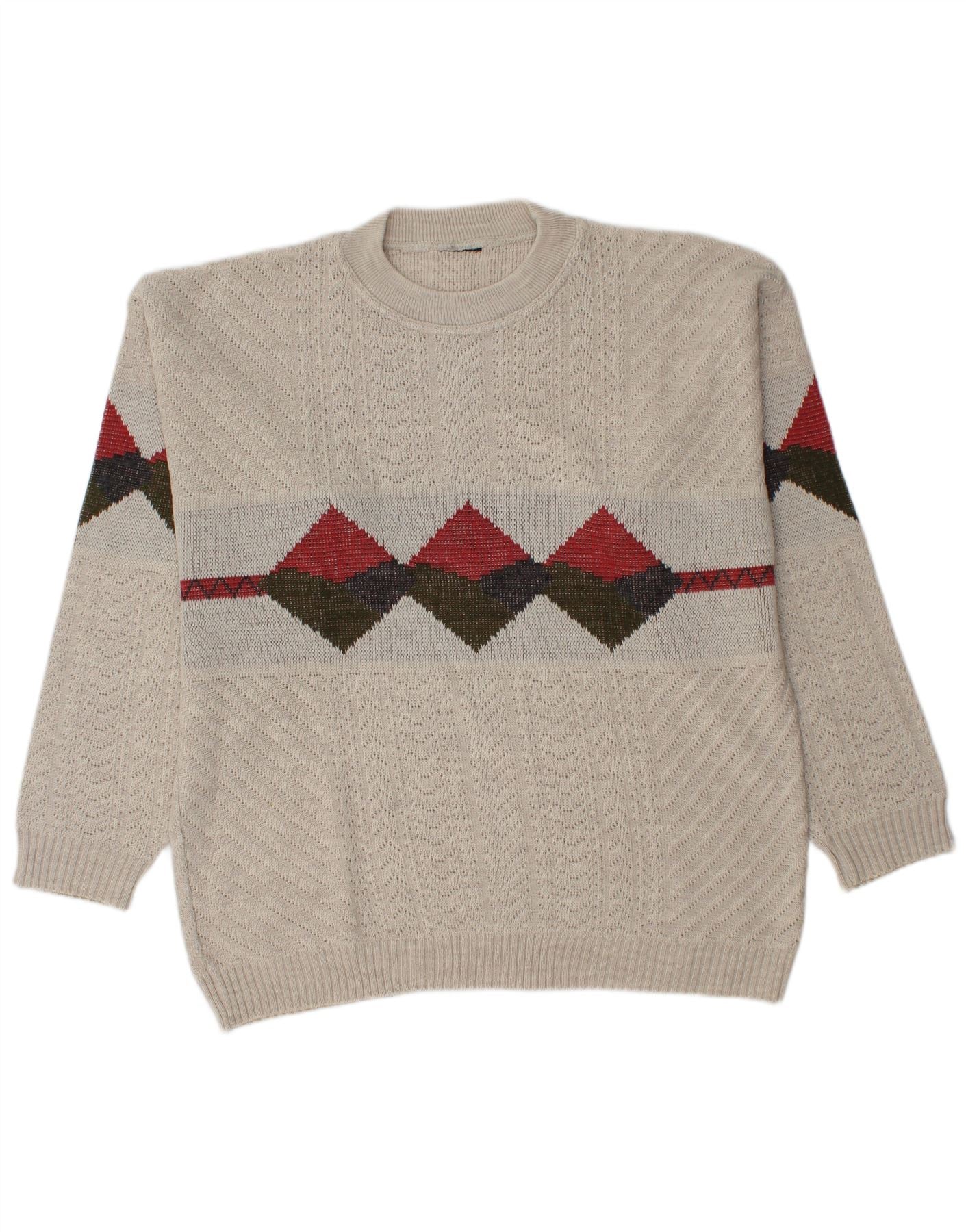 - AI Description: This Vintage mens crew neck jumper sweater is crafted from a soft acrylic and wool blend knit. Its beige hue offers a versatile, classic look. The round neckline and long sleeves provide a comfortable, regular fit. It is a pullover style. A striking geometric pattern in contrasting colours adorns the chest and sleeves. This design adds visual interest without overwhelming the garment.