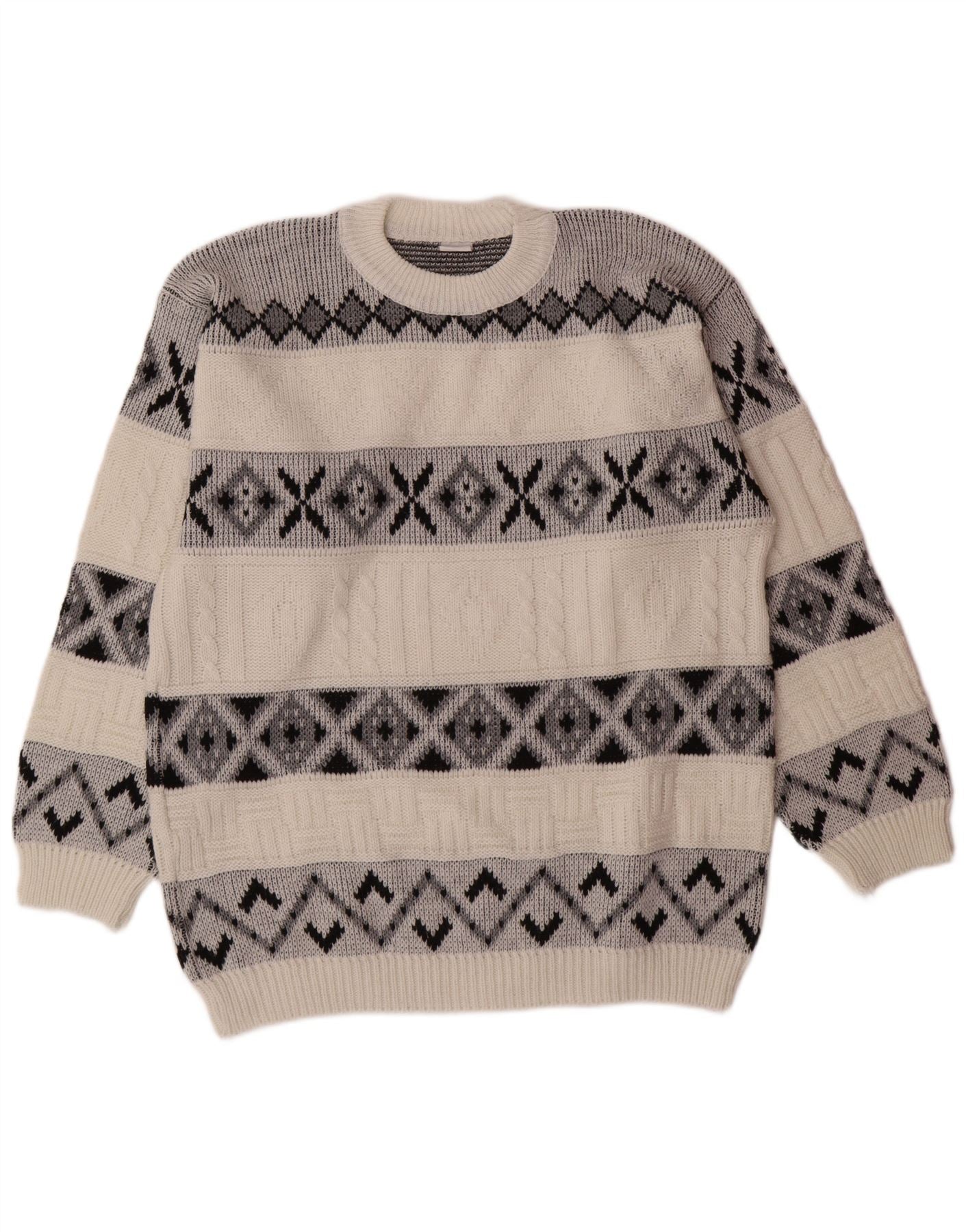 VINTAGE Mens Crew Neck Jumper Sweater Large White Fair Isle