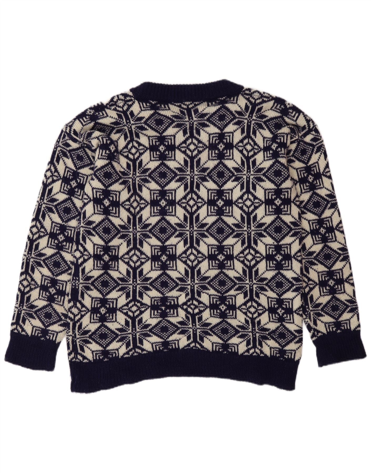 - AI Description: This Vintage mens Crew Neck Jumper Sweater is crafted from a soft knit fabric. It features a striking Fair Isle pattern in navy blue and off white. The round neck and long sleeves offer classic comfort. Ribbed cuffs and hem provide a neat finish. Its regular fit ensures a comfortable, timeless silhouette, perfect for a retro style.