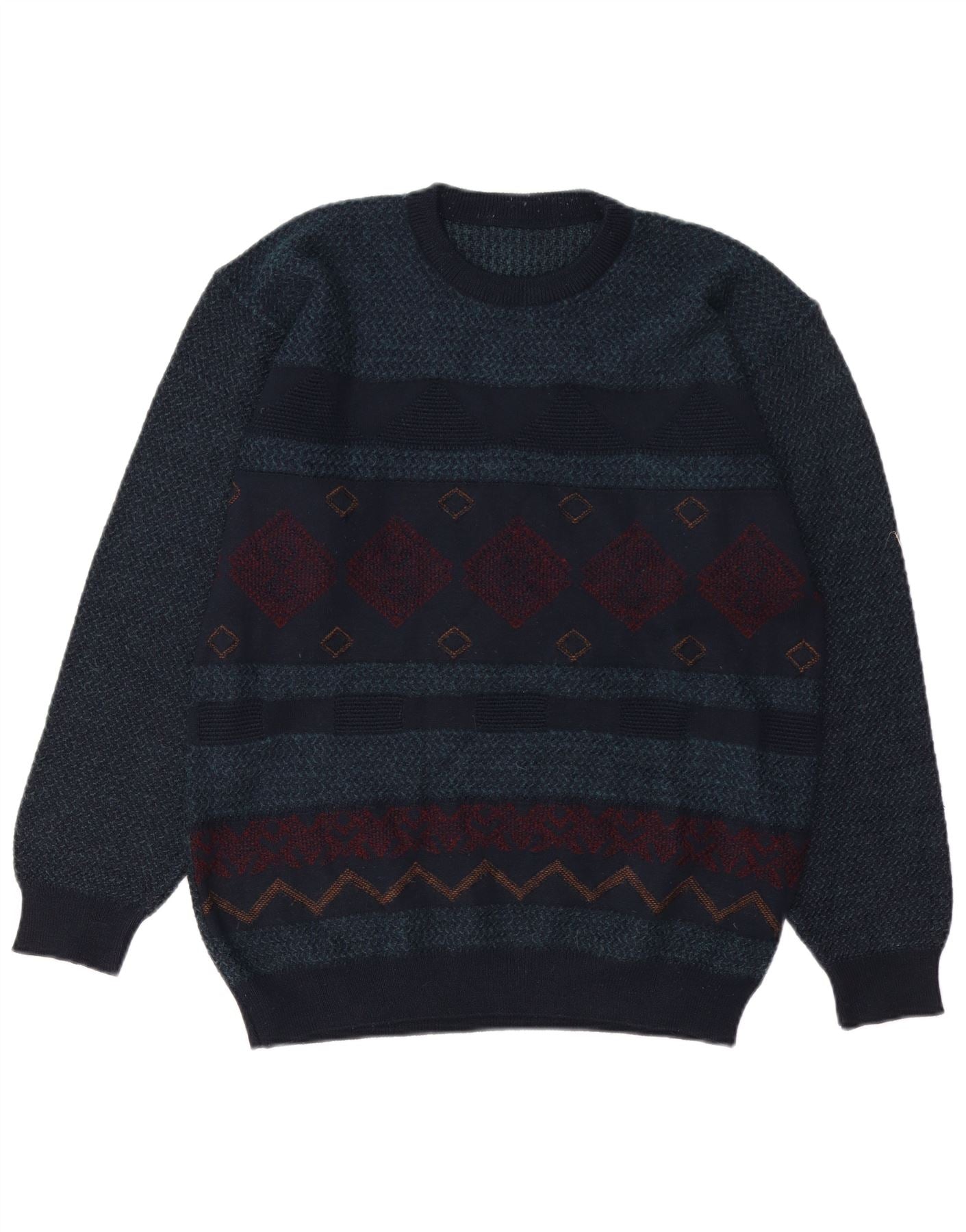VINTAGE Mens Crew Neck Jumper Sweater Medium Navy Blue Geometric