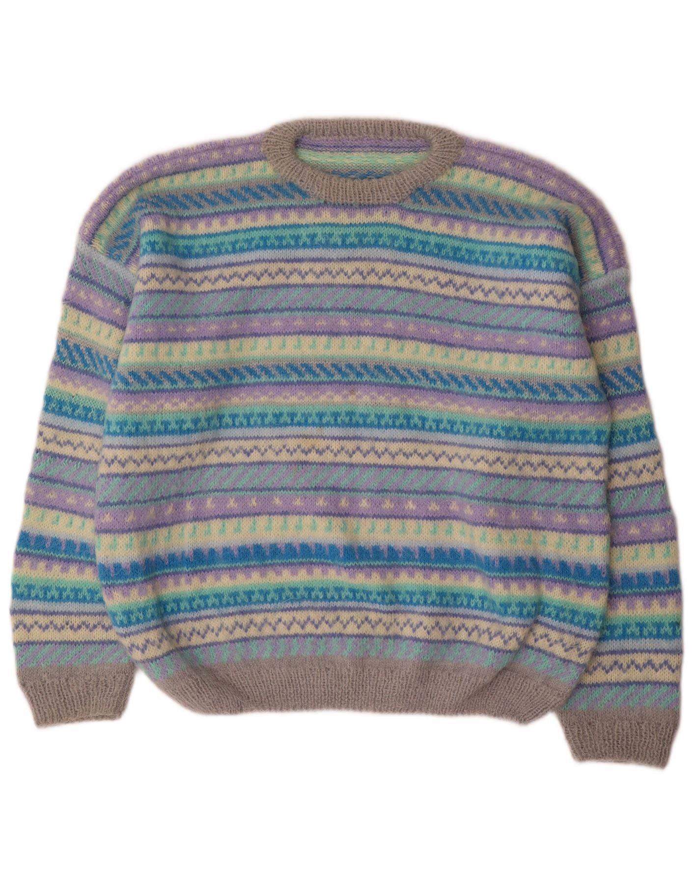 - AI Description: This Vintage mens Jumper Sweater is crafted from a soft knit fabric, offering a cosy feel. It features a vibrant multicoloured Fair Isle pattern, blending shades of blue, purple, and grey. The round neck and long sleeves provide a classic silhouette. Cuffed wrists and hem ensure a snug, comfortable regular fit. This pullover design embodies a retro style, perfect for adding a distinctive touch.