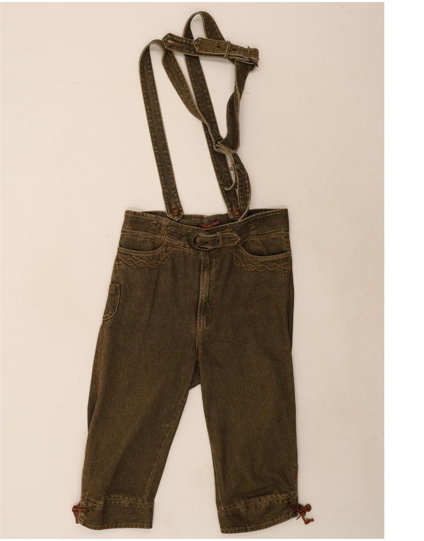 - AI Description: Vintage men's cropped trousers in brown denim. Crafted from 100% cotton, these cowboy-style trousers feature a regular fit, buckle closure, and handy pockets. Size 52. Pre-owned in excellent condition, with minor loose stitching on the waistband, slight discoloration on the legs, and visible wear on the label. Washing instructions: 40°C.