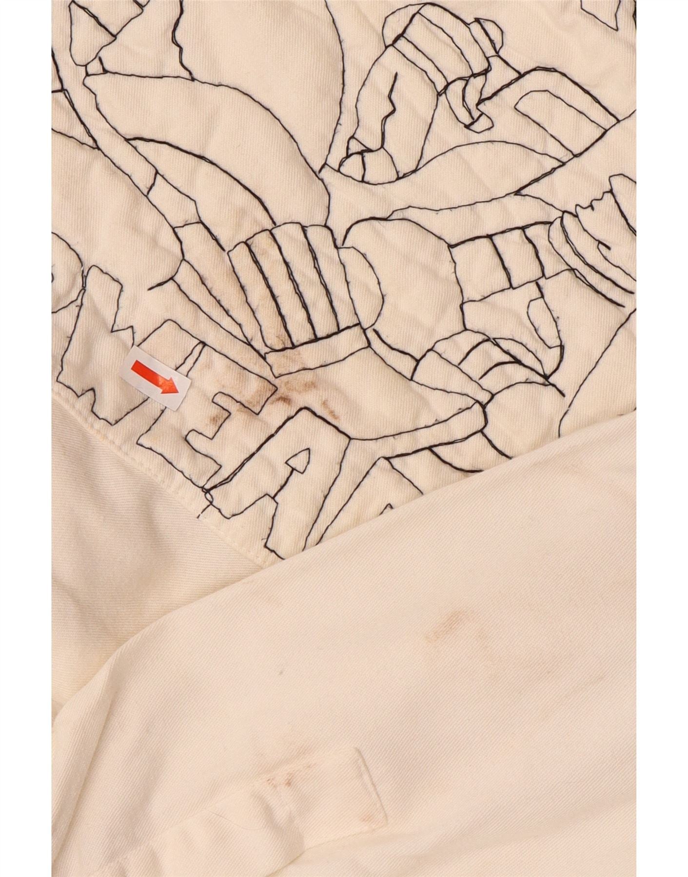 - AI Description: This Vintage mens shirt is crafted from off white woven fabric, offering a comfortable regular fit. It features a collared neckline and a full button-up front for a classic look. Long sleeves with cuffed wrists complete the structure. The shirt is accented with distinctive embroidered graphic detailing across the shoulders and sleeves. This design adds a unique, retro touch to the garment.