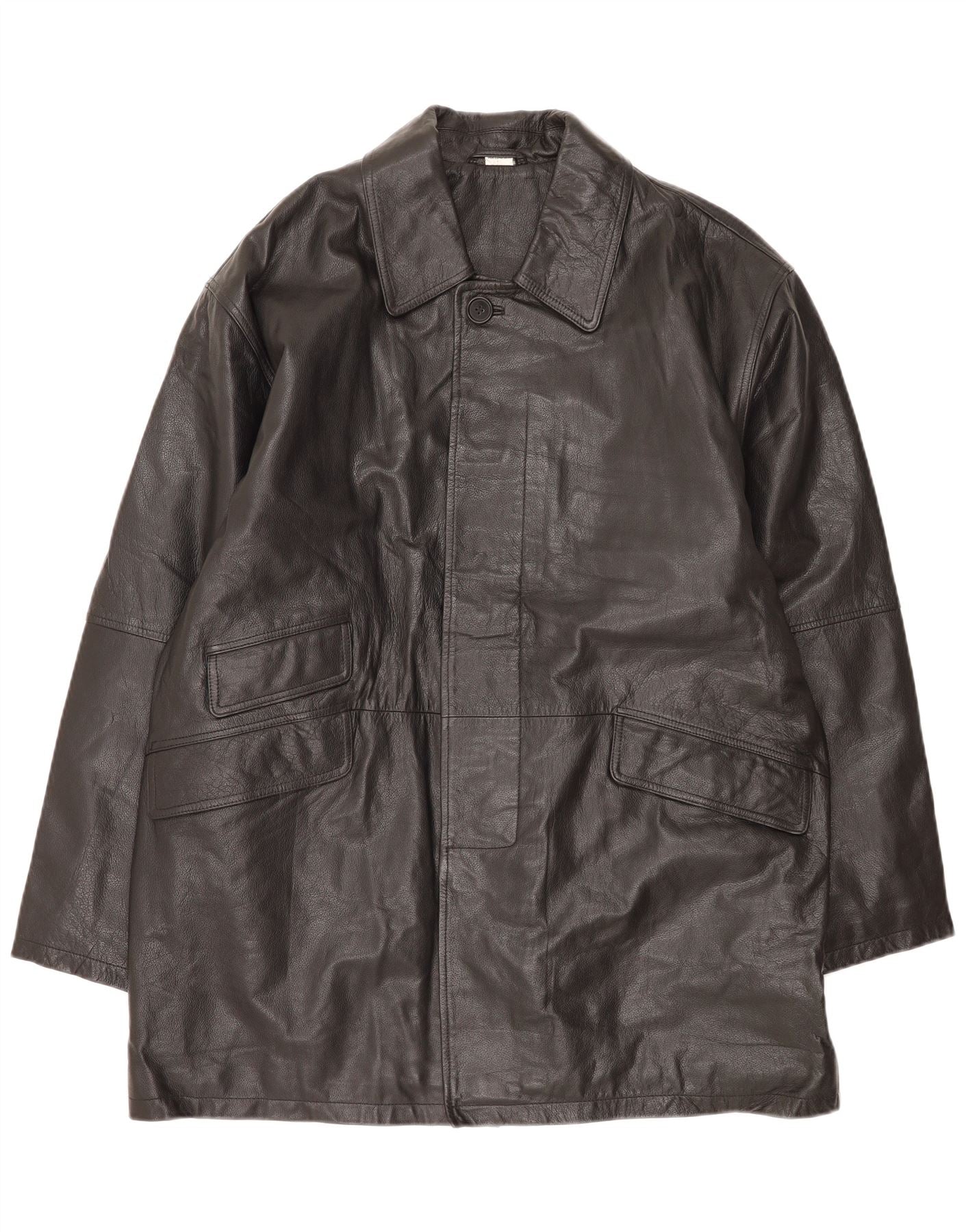 - AI Description: This Vintage mens leather coat is crafted from rich black leather, offering a classic, durable texture. It features a smart collared neckline and a button-up front for a timeless look. Long sleeves and a relaxed fit ensure comfortable wear. The coat includes practical pockets and a smooth polyester lining. This piece combines traditional style with everyday functionality.