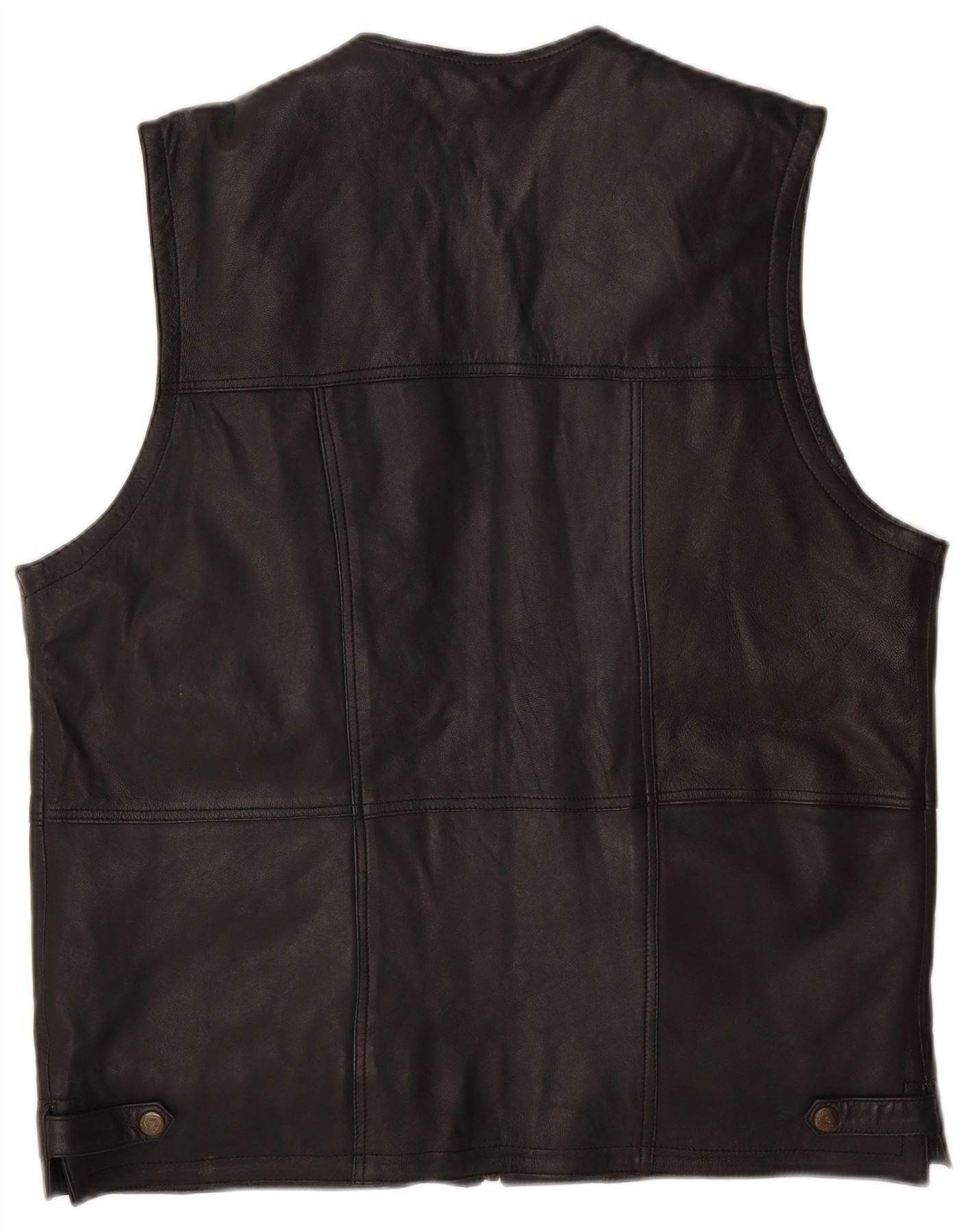 - AI Description: This Vintage mens waistcoat is crafted from supple black natural leather, offering a rugged yet refined texture. It features a classic V-neckline and a full zip closure for a secure fit. The sleeveless design ensures ease of movement. Multiple pockets with zip and flap closures provide practical storage and add to its biker style. A regular fit ensures comfortable wear, making it a versatile layering piece.