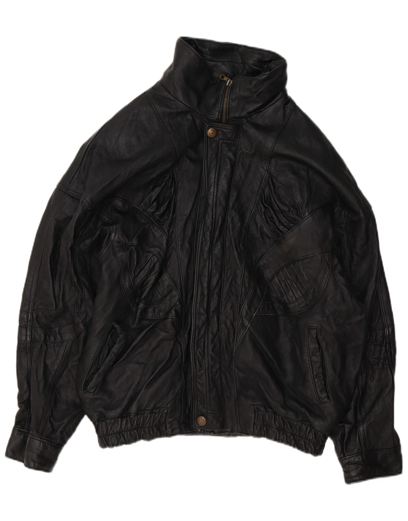 - AI Description: This Vintage mens bomber jacket is crafted from supple black leather, offering a luxurious feel. It features a high neck and a full zip closure for a secure fit. Long sleeves and an elasticated waist define its relaxed silhouette. Practical pockets add functionality. The collared design and zip accents complete its classic 80s style.