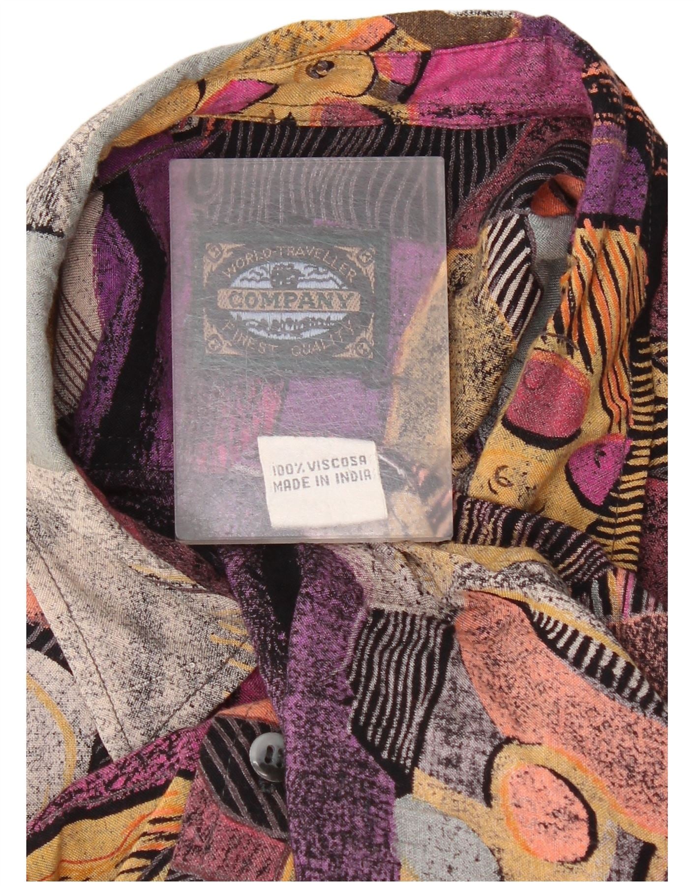 - AI Description: This Vintage mens shirt is crafted from 100 percent viscose rayon, offering a lightweight and fluid drape. It features a bold multicoloured abstract pattern with colourblock elements in shades of red, purple, and orange. The collared neckline and short sleeves provide a classic silhouette. A full button closure runs down the front. Designed for a relaxed, loose fit, it includes practical front pockets. This retro style ensures comfort and a distinctive look.
