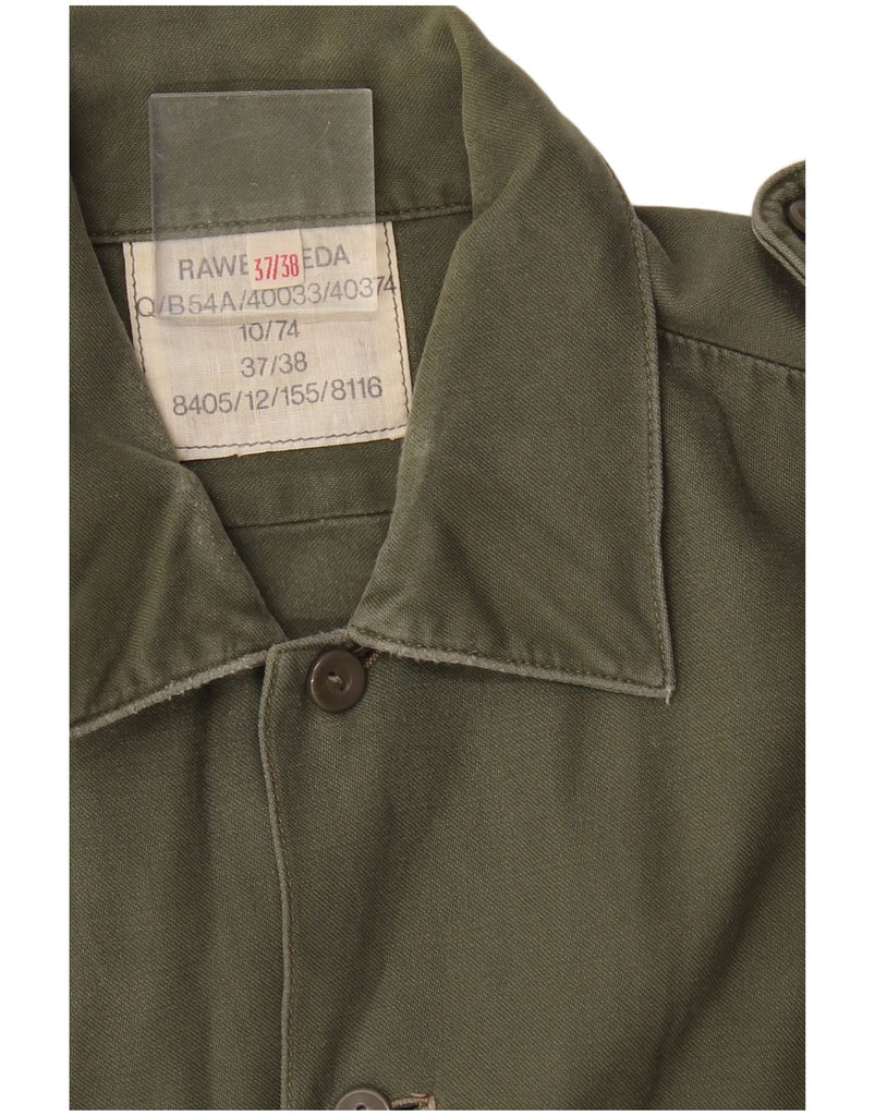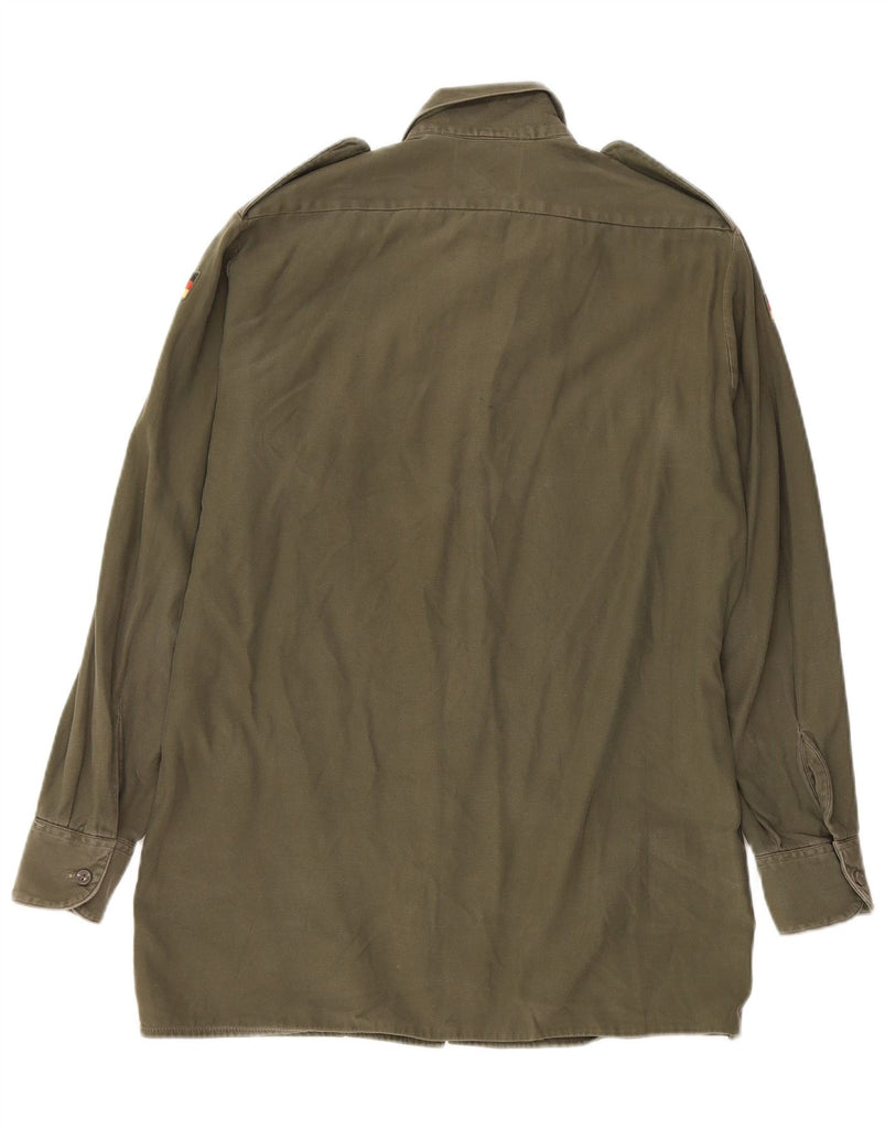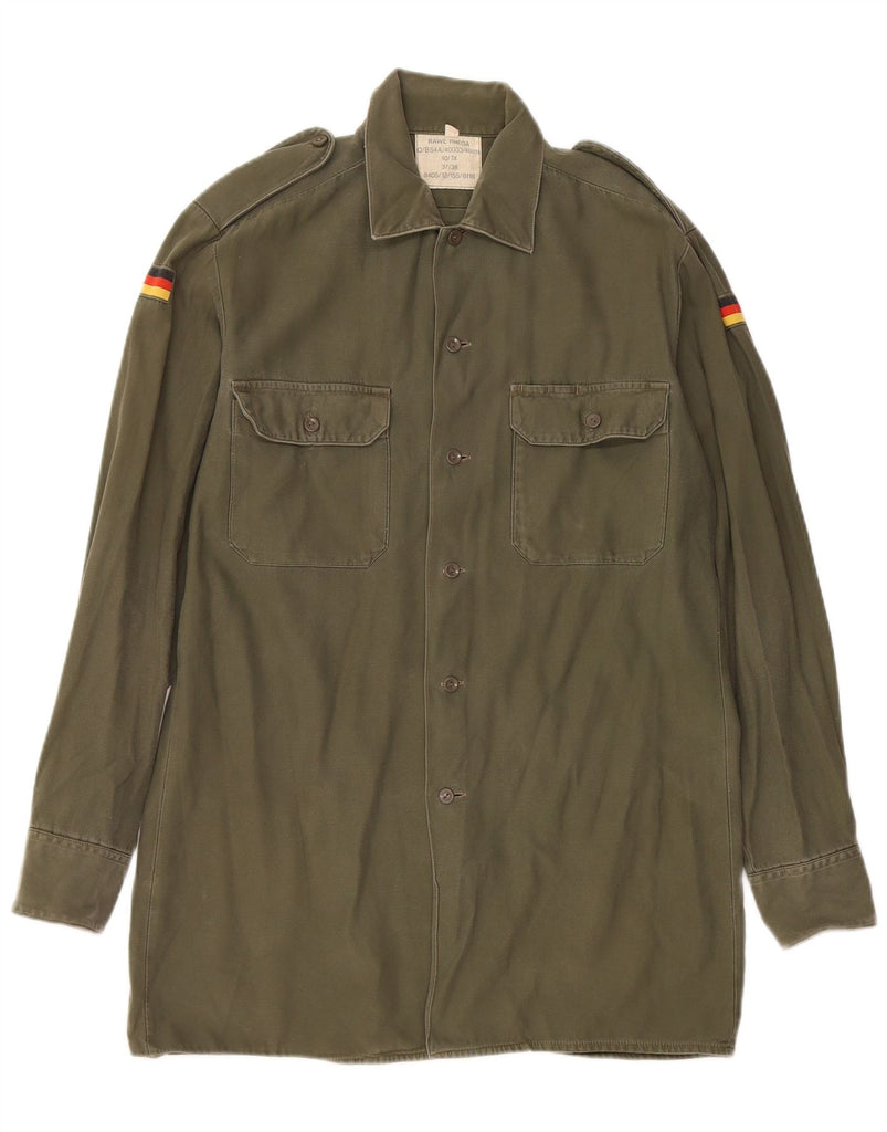 - AI Description: This Vintage mens shirt is crafted from a durable green woven fabric. It features a classic collared neckline and long sleeves. The regular fit offers comfortable wear. Button closures secure the front and cuffs. Utility pockets add practical detail. Its military inspired design provides a robust, functional aesthetic.