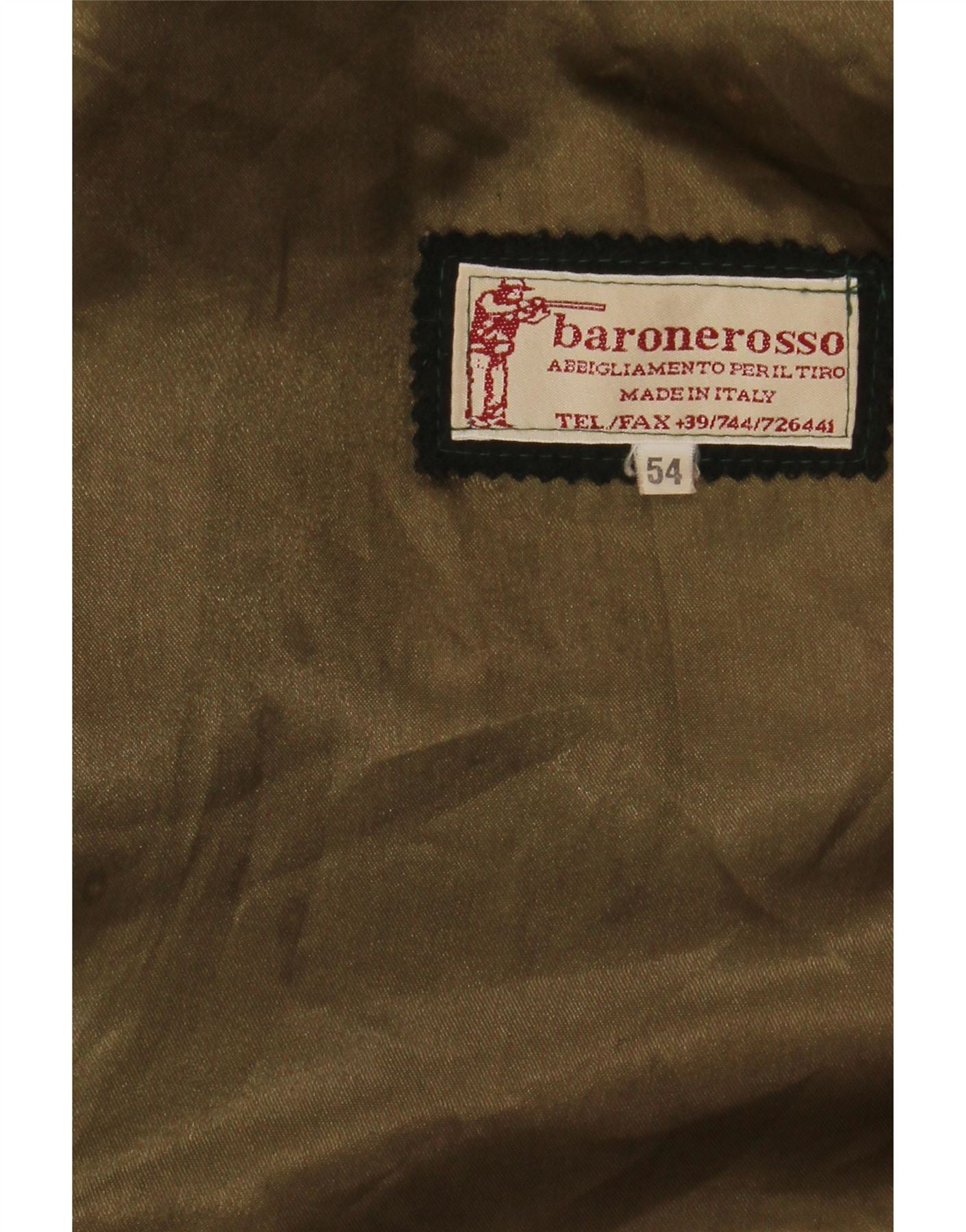 - AI Description: This Baronerosso mens jacket is crafted from a robust dark green woven fabric. It features a contrasting green collared neckline. The classic regular fit offers comfort and style. Long sleeves and a button-up front complete the traditional design. It is fully lined for added warmth and durability. A distinctive quilted shoulder patch adds a practical shooting detail. Front flap pockets provide functional storage. This classic piece is ideal for country pursuits.
