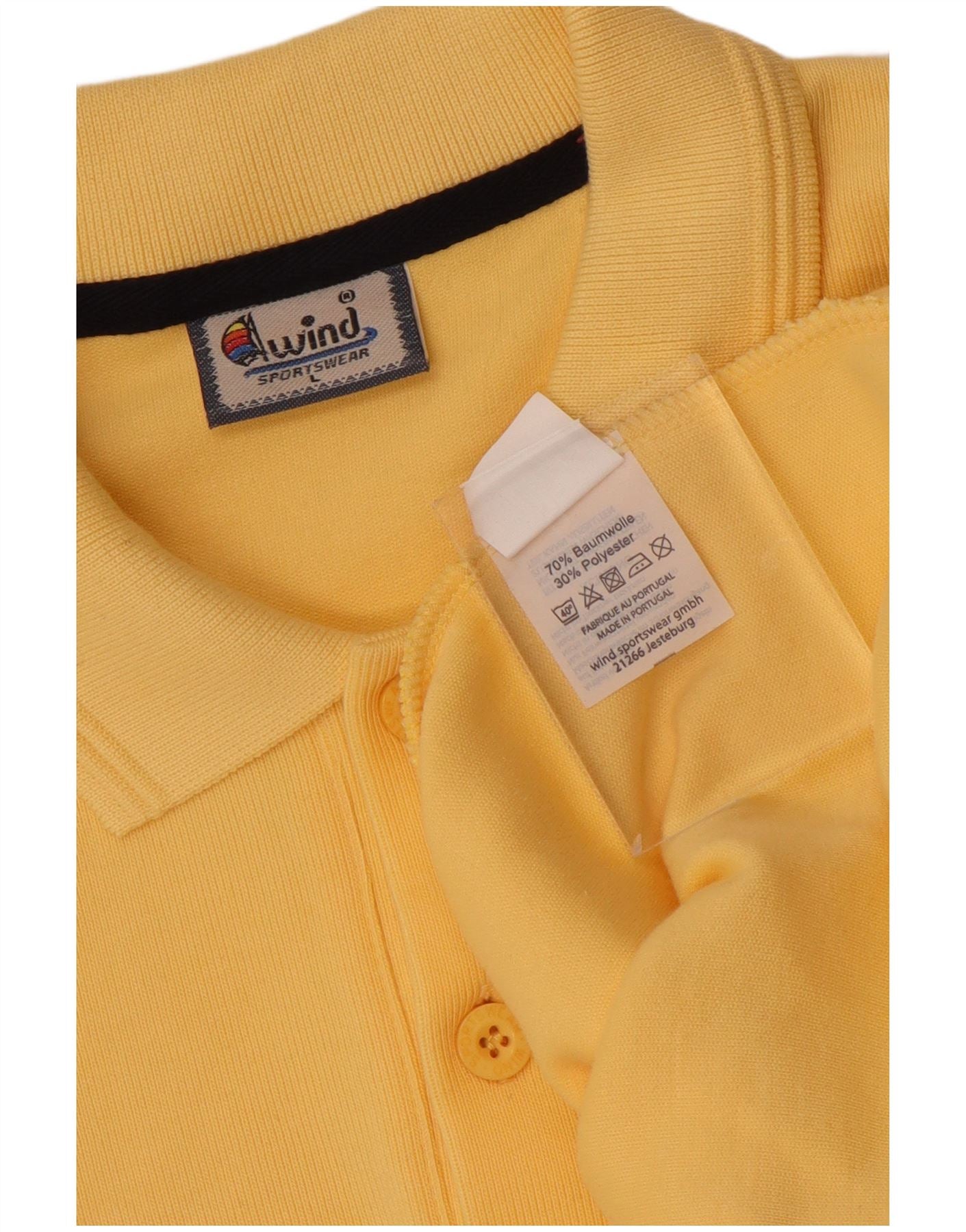 - AI Description: This Wind Sportswear mens long sleeve polo shirt is crafted from a soft yellow cotton blend fabric. It features a classic collared neckline and a three-button placket. Long sleeves finish with comfortable cuffed wrists. The regular fit ensures a comfortable silhouette. An embroidered graphic detail adorns the chest, adding a subtle brand touch. This versatile top is perfect for casual wear.