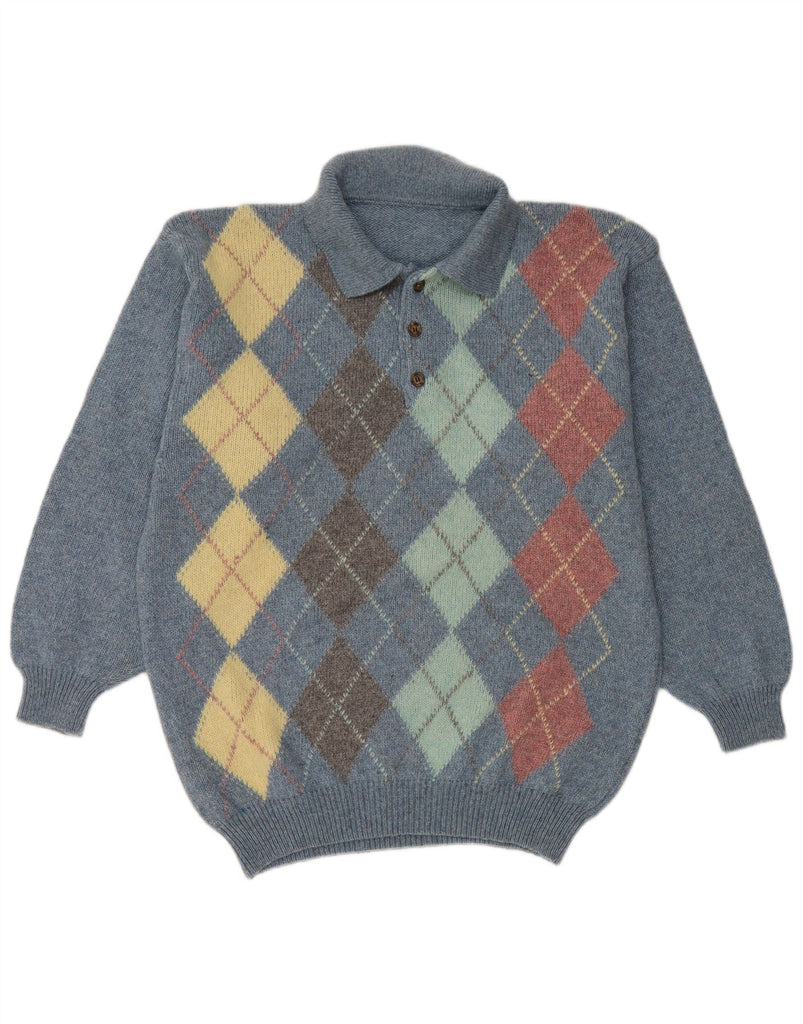 VINTAGE Mens Polo Neck Jumper Sweater Medium Blue Argyle/Diamond Wool