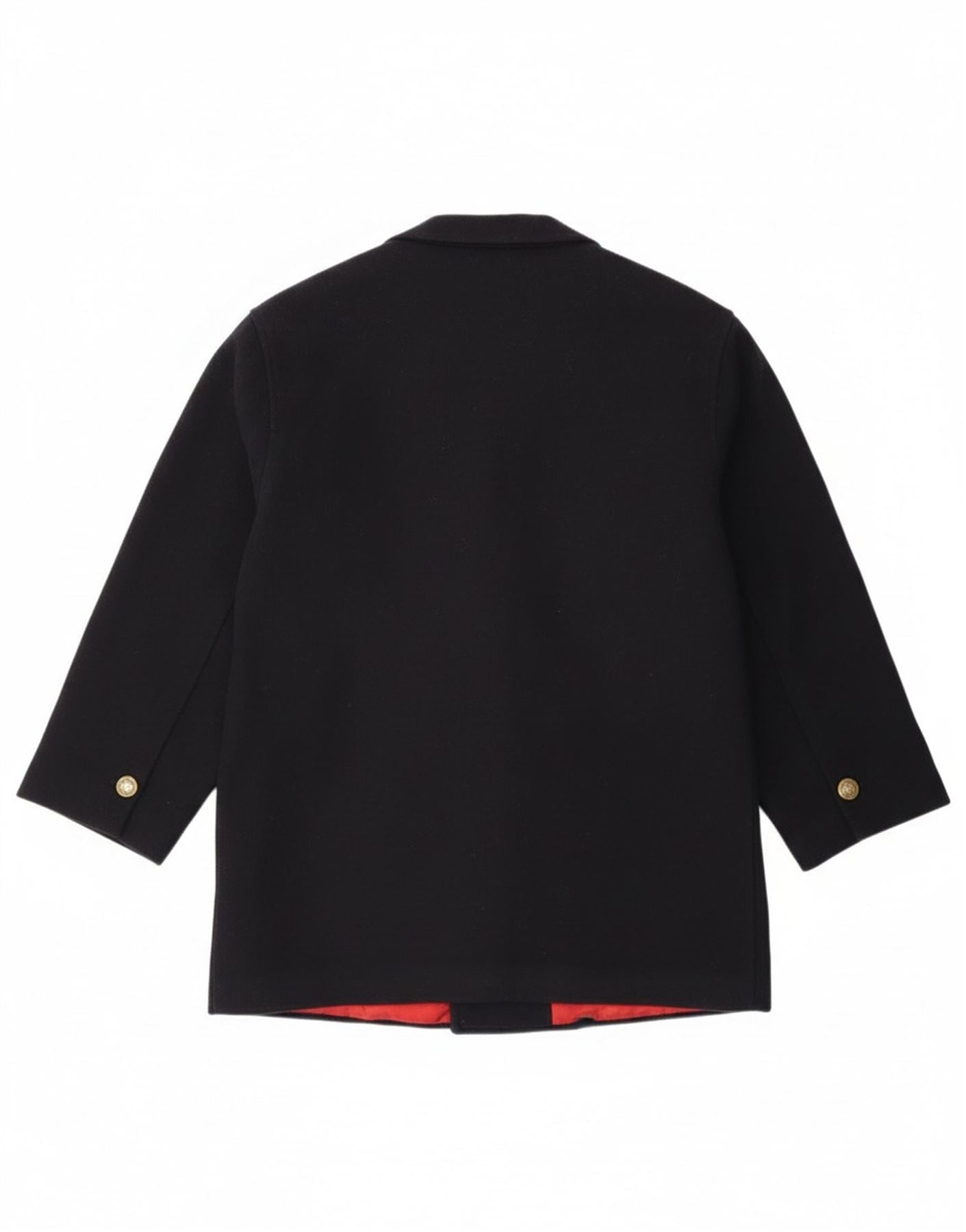 - AI Description: This Vintage mens blazer jacket is crafted from a rich navy blue wool blend, offering a refined woven texture. It features a classic double-breasted design with a collared neckline. Long sleeves provide a traditional silhouette. The regular fit ensures comfortable wear. Tonal buttons secure the front closure and add a subtle accent. Practical pockets enhance its functional appeal. The vibrant red interior lining provides a striking contrast.