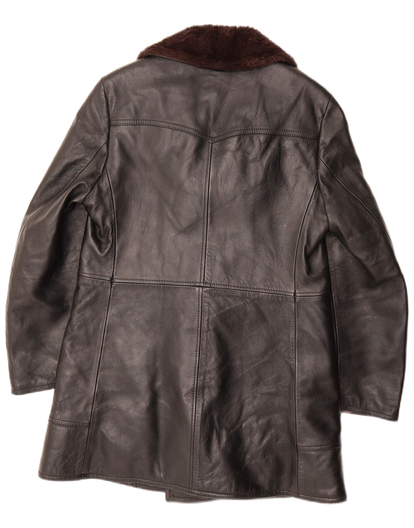 - AI Description: This Confezioni women's leather coat is crafted from luxurious black leather, offering a smooth, rich texture. It features a classic double-breasted design with a collared neckline and long sleeves. The regular fit ensures comfortable wear. Tonal button closures and practical pockets enhance its timeless appeal. A sophisticated fur trim adds an elegant accent. This heavyweight coat provides warmth and a refined silhouette.