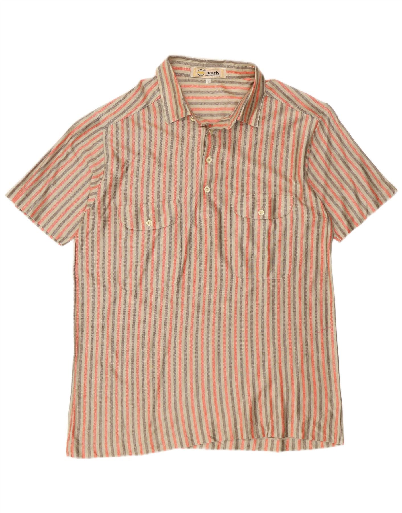 - AI Description: This Vintage Maris mens T-shirt is crafted from 100 percent Mako Cotton knit, offering a soft texture. It features a distinctive multicoloured striped pattern in shades of grey and red. The collared neckline and short sleeves provide a classic silhouette. A pullover style with button accents and two chest pockets add functional detail. Its regular fit ensures comfortable wear with a retro appeal.