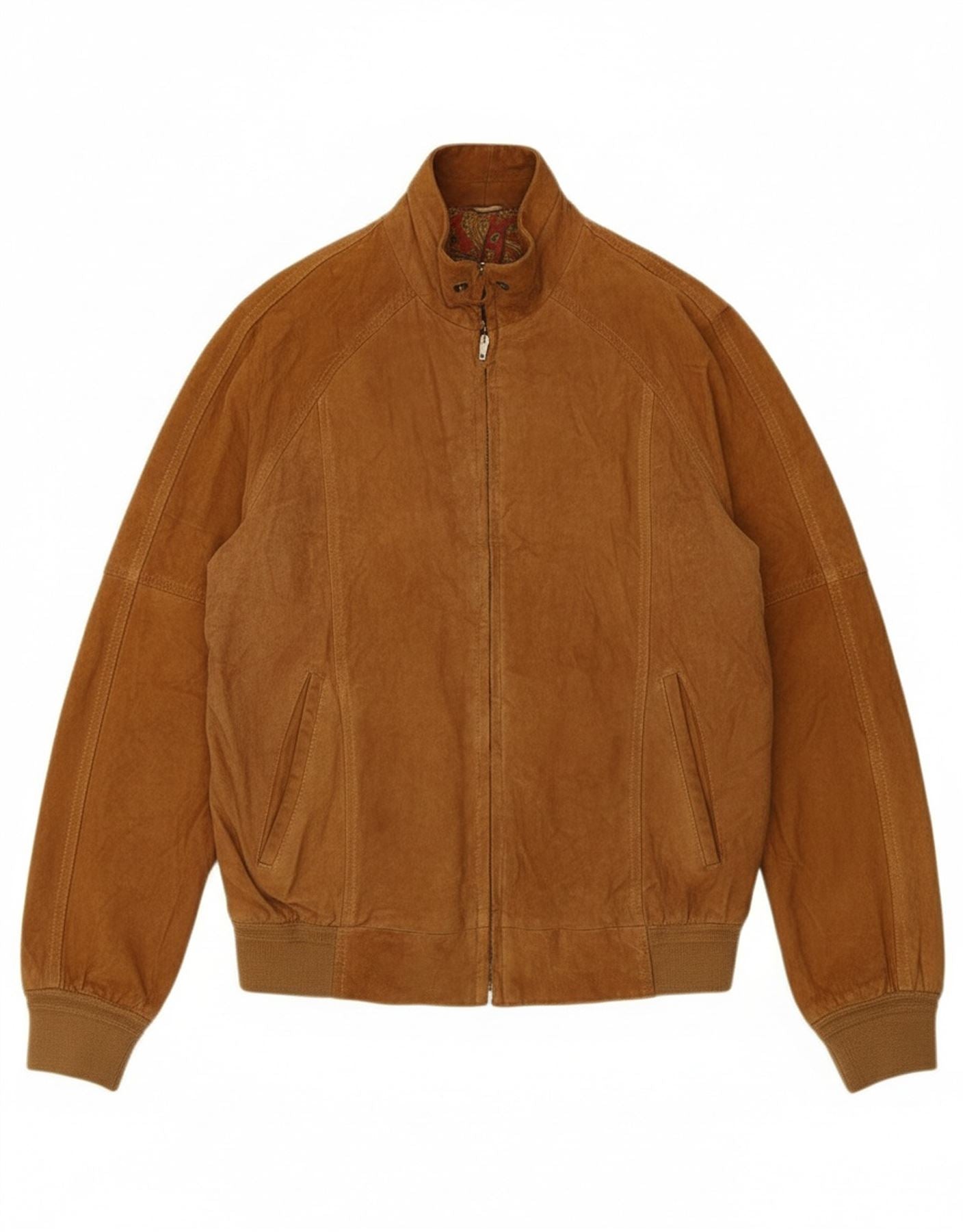 - AI Description: This Vintage men's Bomber Jacket is crafted from rich brown suede, offering a luxurious texture. It features a classic collared neckline and a full zip closure for versatile styling. Long sleeves and a regular fit provide comfort and a timeless silhouette. Practical pockets add functionality, while the soft lining ensures warmth. This jacket embodies classic style with refined details.