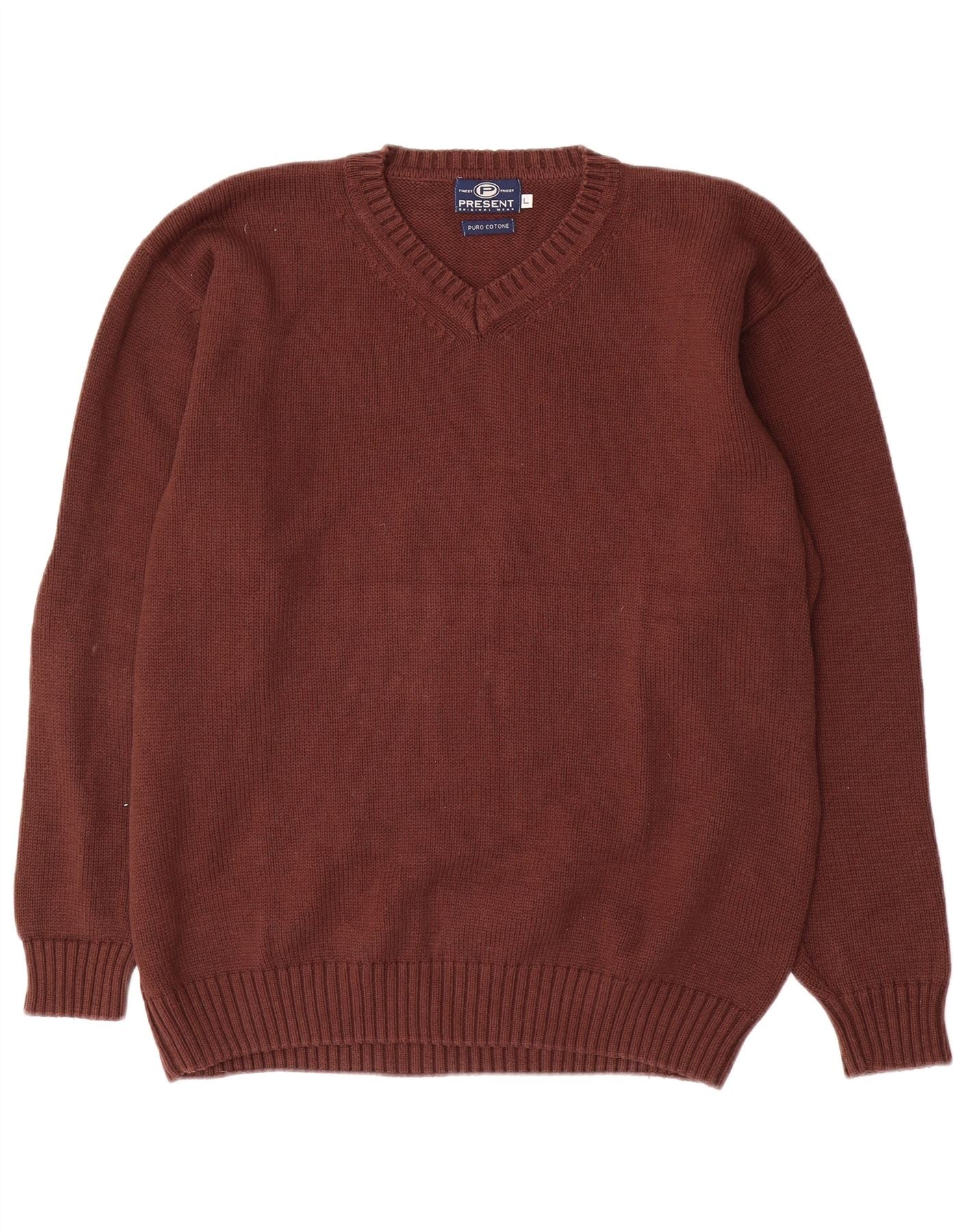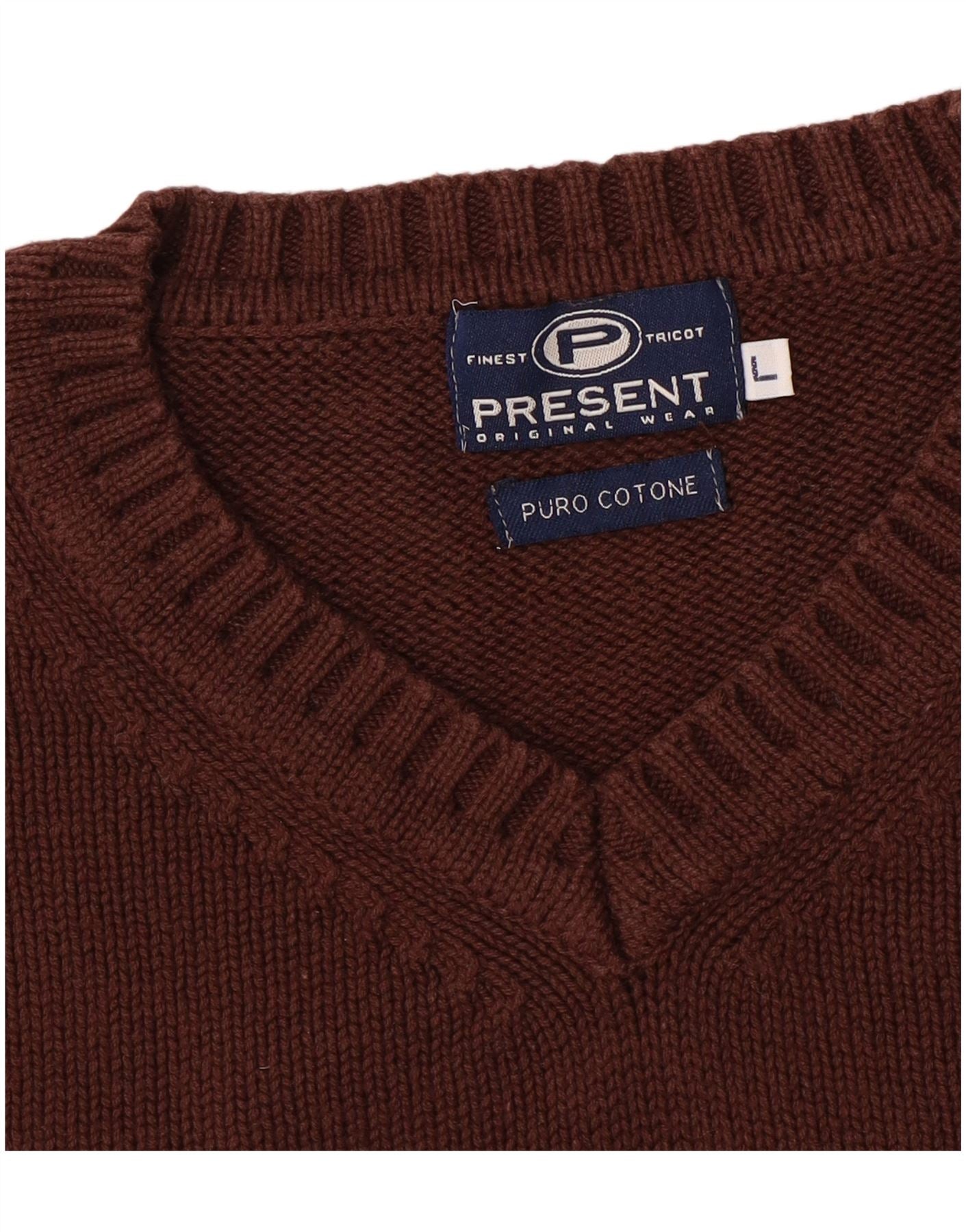 VINTAGE Mens V-Neck Jumper Sweater Large Brown Cotton