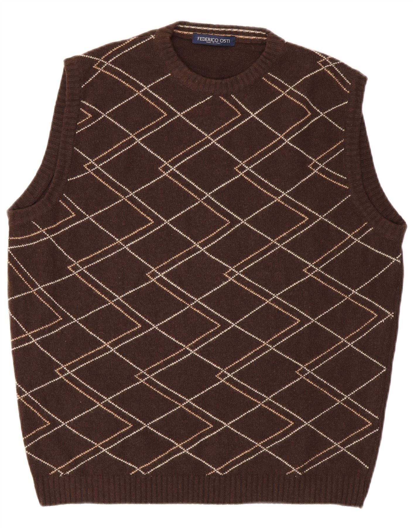 - AI Description: This Federico Osti mens sleeveless jumper is crafted from a luxurious blend of extrafine merino wool, viscose, cashmere, and polyamide. The rich brown knit offers a soft, comfortable feel. It features a classic round neck and a regular fit. A distinctive argyle diamond pattern in contrasting tones adorns the front. This pullover style ensures easy wear, perfect for versatile layering.