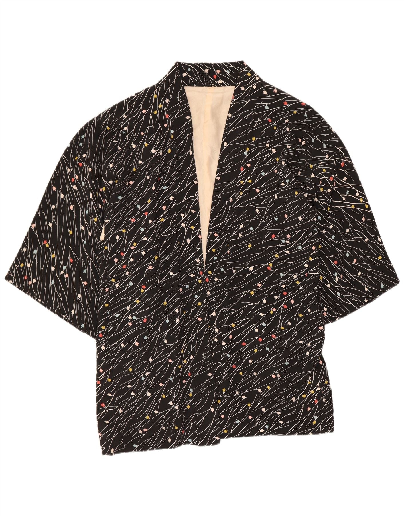- AI Description: This Vintage womens Kimono Jacket is crafted from a black woven fabric with a smooth finish. It features an intricate abstract pattern of delicate white lines and small colourful dots. The collared neckline and open front create a relaxed silhouette. Its 3/4 length sleeves offer a comfortable, loose fit. This lined jacket drapes elegantly.