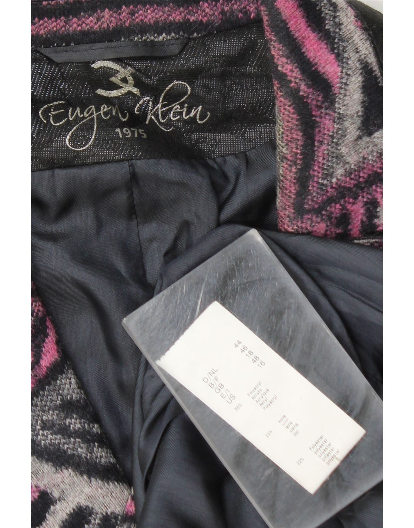 - AI Description: This Eugen Klein womens jacket is crafted from a blended fabric with a striking multicoloured geometric pattern. The knit texture combines pink, black, and grey tones for a retro feel. It features a classic collared neckline and long sleeves. A single button closure fastens the front, complemented by subtle pockets. The jacket is fully lined, offering a comfortable and structured regular fit.