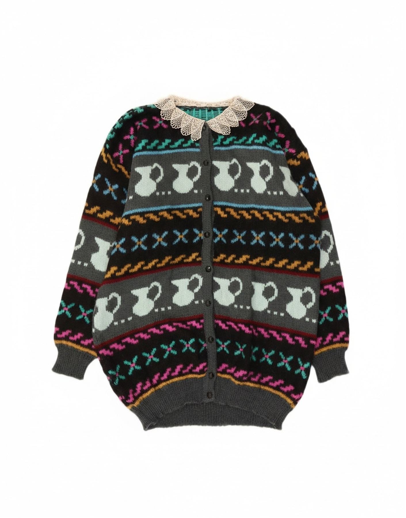 - AI Description: This Vintage womens cardigan sweater is crafted from a soft, multicoloured knit fabric. It features an abstract pattern of jugs and geometric motifs in vibrant hues against a dark background. A delicate lace collar adds a charming, retro touch. The long-sleeved design has a relaxed fit, ensuring comfort. A full button-front closure provides classic styling. This piece offers a unique, cosy aesthetic.