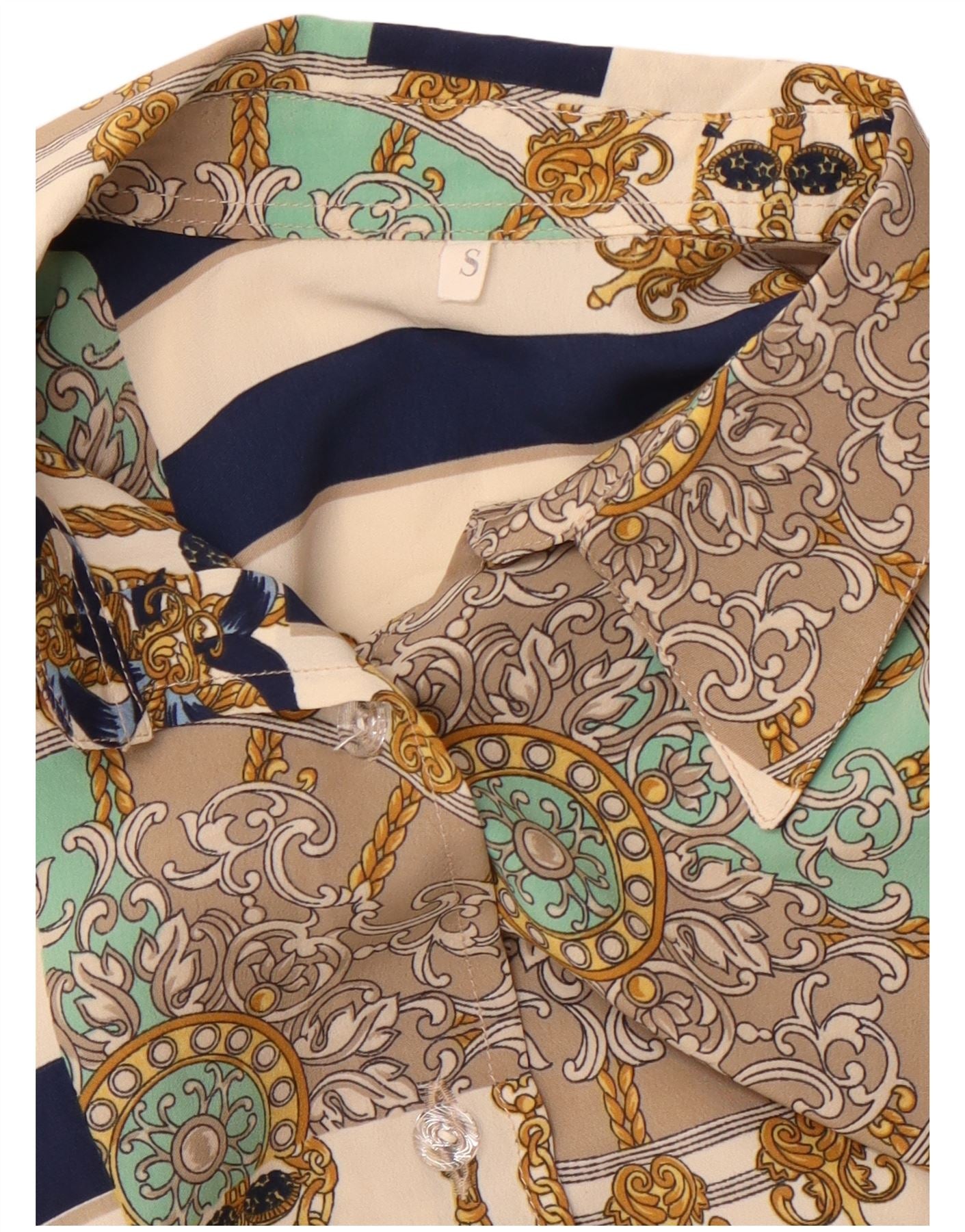 - AI Description: This Vintage womens shirt blouse is crafted from a lightweight blended fabric, offering a smooth, flowing drape. It features a striking multicoloured patchwork pattern, combining abstract motifs with rich gold and navy blue accents. The collared neckline and button closure provide a classic structure. Long sleeves and a regular fit ensure comfortable wear. Practical pockets add functional detail.