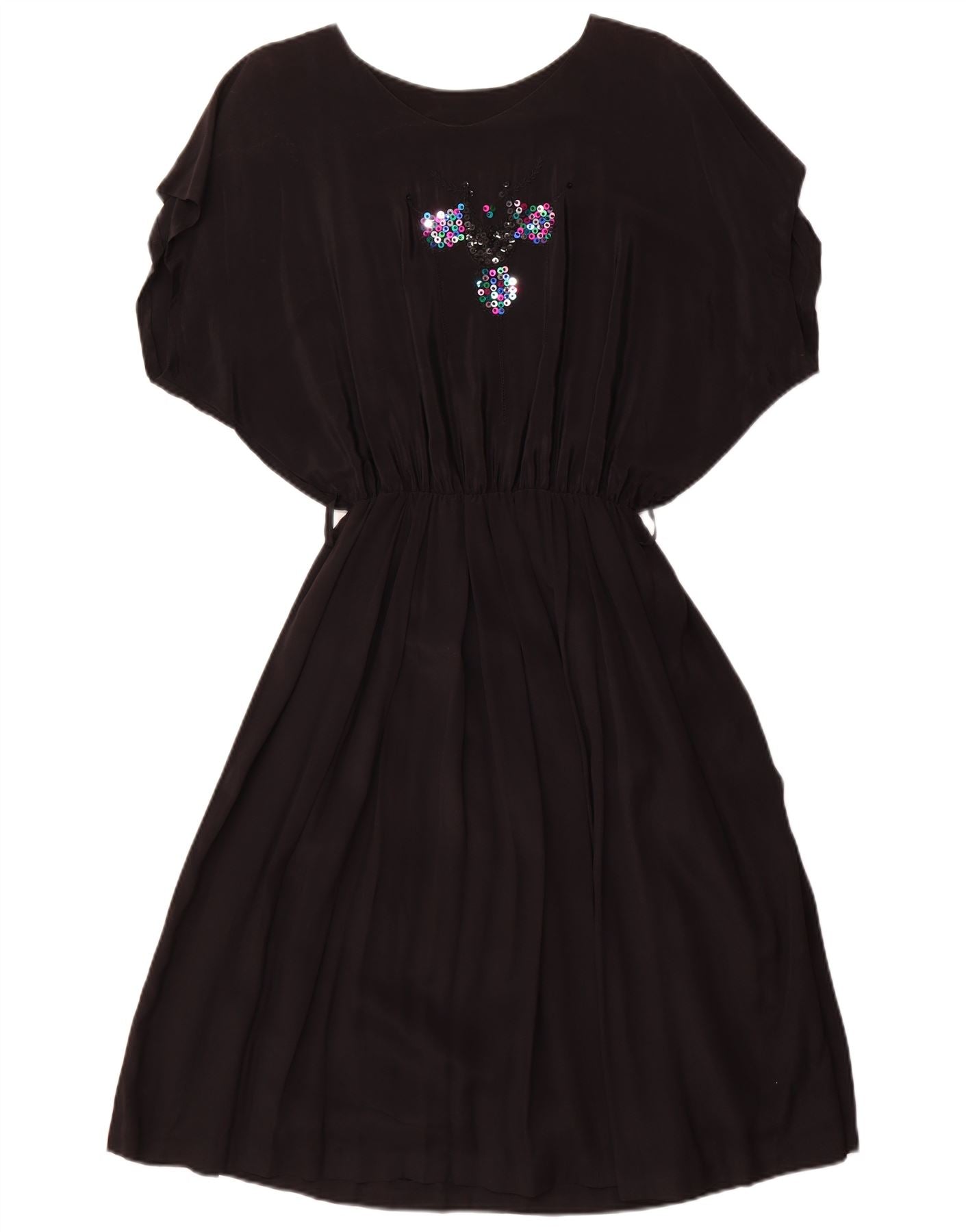 - AI Description: This Vintage womens Kaftan dress is crafted from a soft blended fabric in classic black. It features a relaxed, oversized fit with a round neckline and short, flowing sleeves. An elasticated waist cinches the silhouette, creating a flattering shape. A vibrant sequin embellishment, depicting an insect, adorns the front bodice. This pullover style offers bohemian charm and effortless wear.