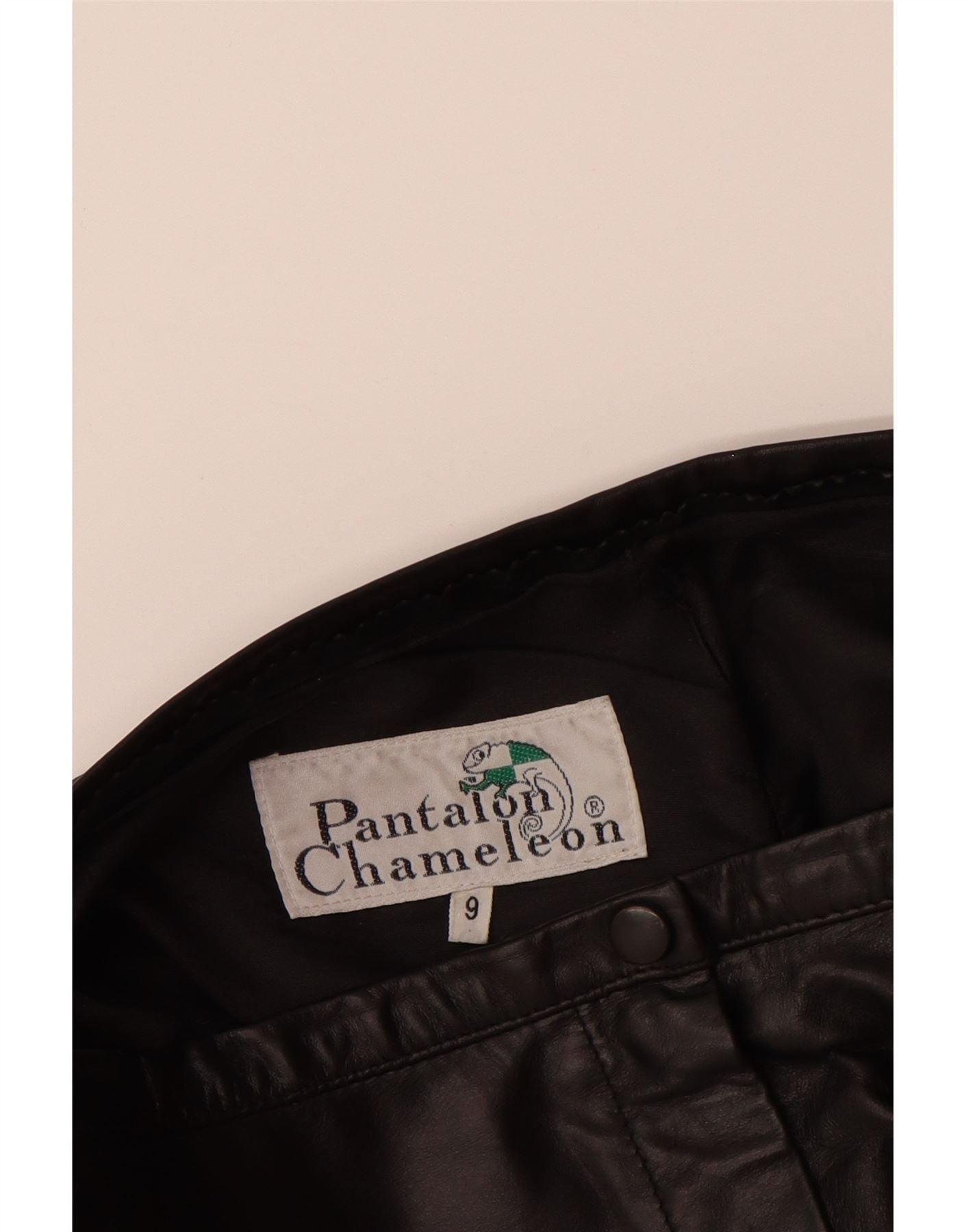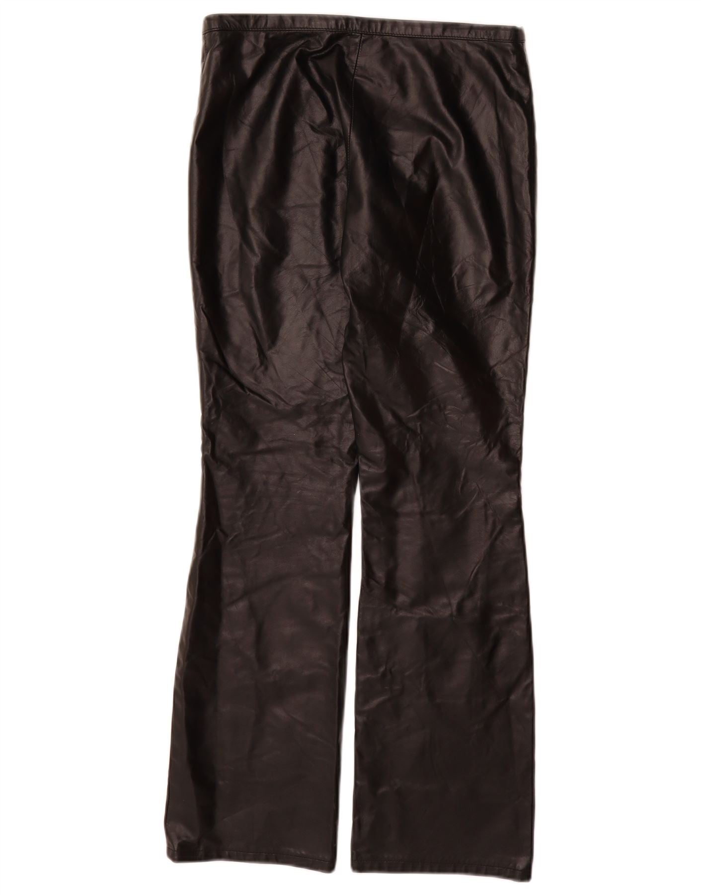 - AI Description: These Vintage women's faux leather trousers offer a sleek black finish with a smooth texture. The mid rise waist features a button closure for a classic fit. They fall into a flattering flare silhouette, providing a confident, contemporary look. Practical pockets add functional detail. The regular fit ensures comfort and versatile styling.