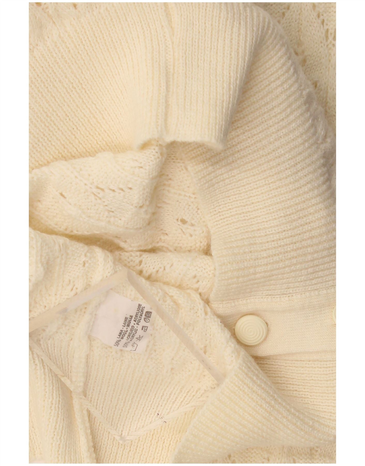 - AI Description: This Vintage womens cardigan sweater is crafted from a soft wool and acrylic blend knit. The off white fabric features a delicate lace pattern. It has a classic V-neckline and long sleeves. The regular fit ensures comfortable wear. Tonal buttons provide a neat front closure. Ribbed cuffs and hem complete the traditional design.