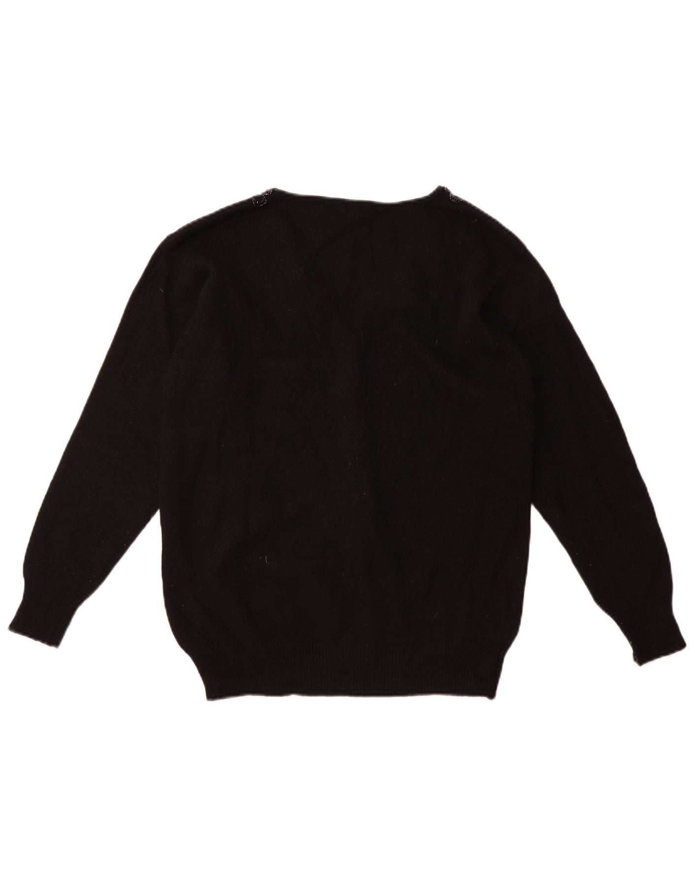 - AI Description: This Vintage womens cardigan sweater is crafted from a fine black knit fabric, offering a soft texture. It features a classic V-neckline and long sleeves. The regular fit ensures comfortable wear. Distinctive square buttons adorn the front closure. The neckline is elegantly detailed with intricate beading, adding a refined touch.