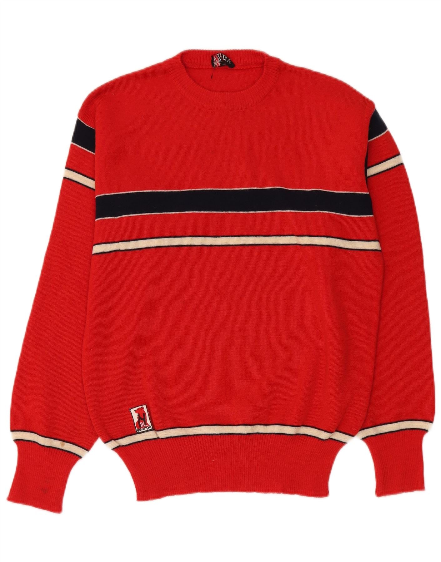 - AI Description: This Vintage mens Crew Neck Jumper Sweater is crafted from a comfortable red knit fabric. It features a classic round neckline and long sleeves with cuffed wrists. The regular fit ensures ease of movement. Bold navy blue and white stripes adorn the chest and sleeves, adding a retro touch. A subtle logo detail completes the design, offering a timeless, casual style.