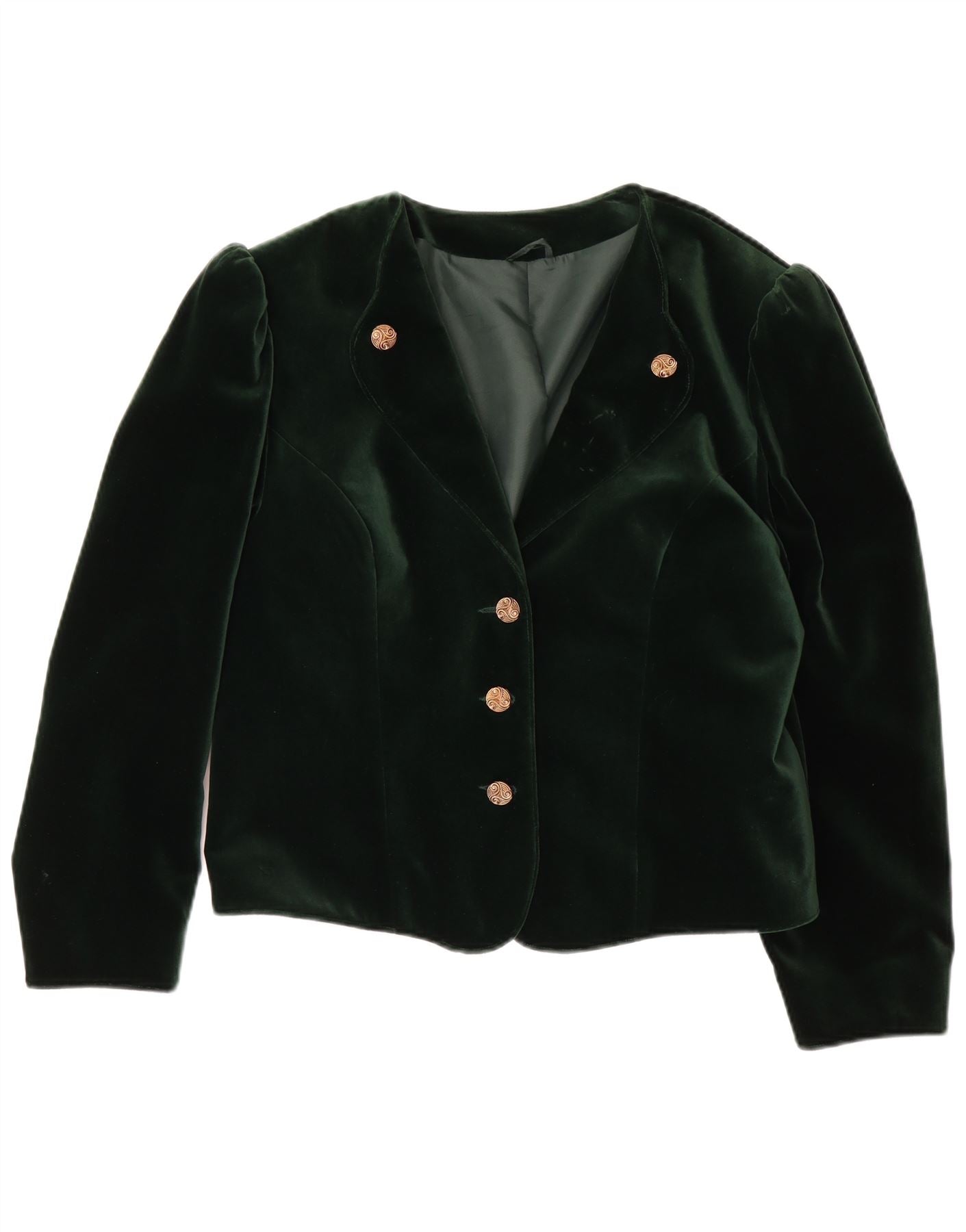 - AI Description: This Vintage womens jacket is crafted from luxurious green velvet, offering a soft, rich texture. It features a round neckline and long sleeves. The regular fit provides a comfortable silhouette. Decorative gold-toned buttons adorn the front closure and shoulders. The jacket is fully lined for added comfort and structure. Its retro style is evident in the detailing.