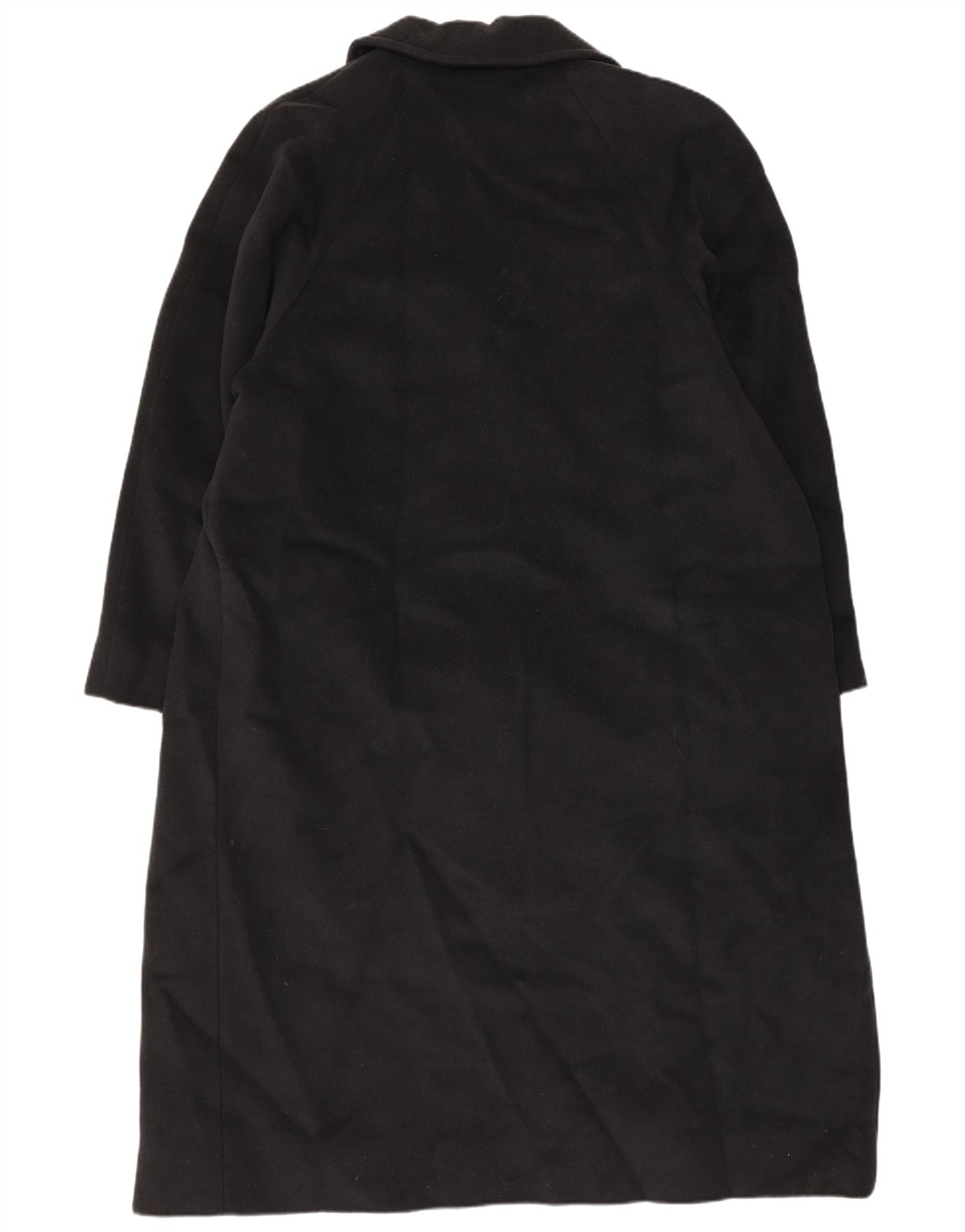 - AI Description: This Vintage womens overcoat is crafted from luxurious pure virgin wool offering a refined woven texture in a classic black hue. It features a sophisticated doublebreasted button closure and a sharp collared neckline. Long sleeves provide elegant coverage. The regular fit ensures comfortable wear. Practical pockets are integrated into the design. This piece is fully lined for added warmth and comfort embodying a timeless Italian classic style.