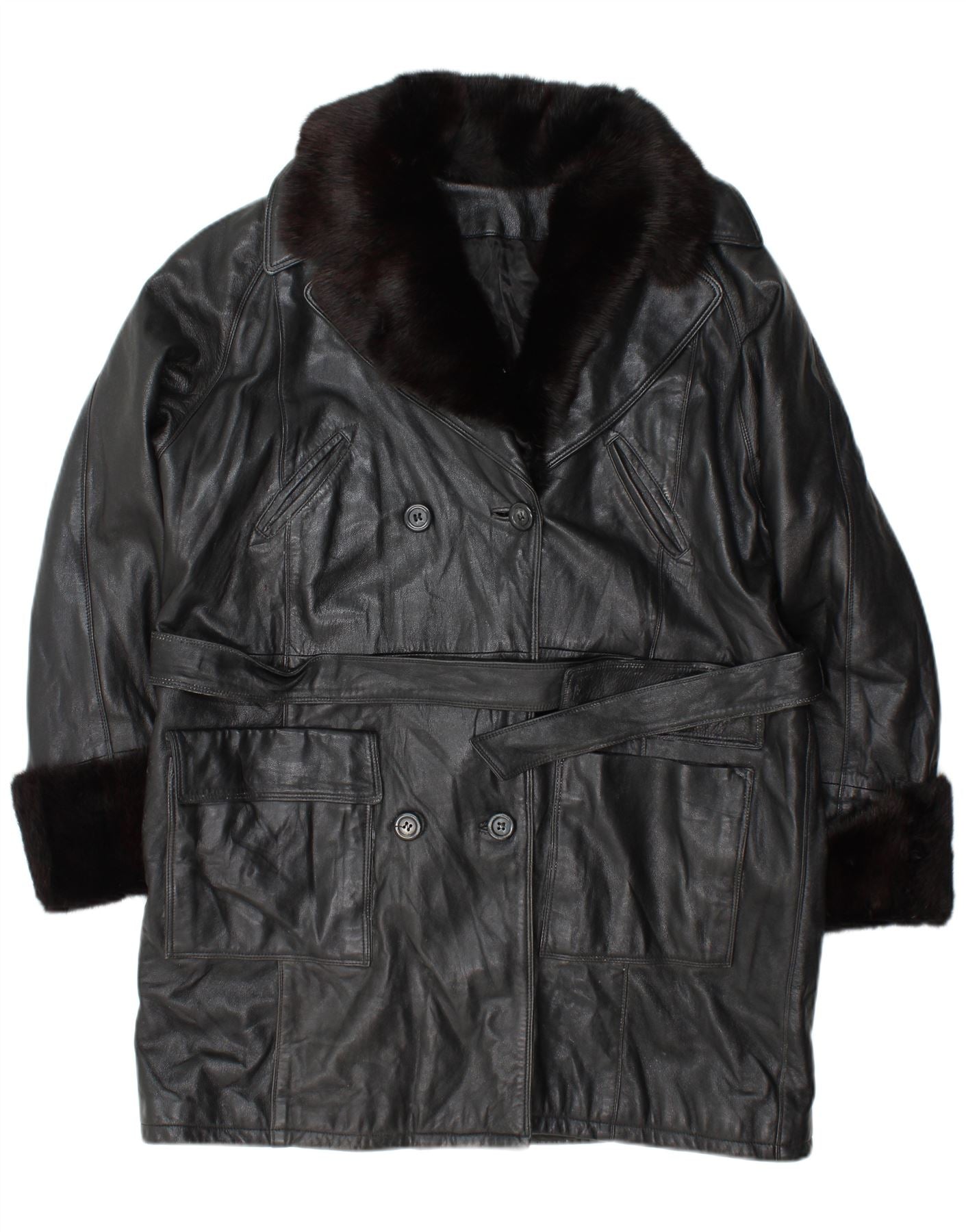 VINTAGE Womens Double Breasted Leather Coat US 10 Large Black Leather