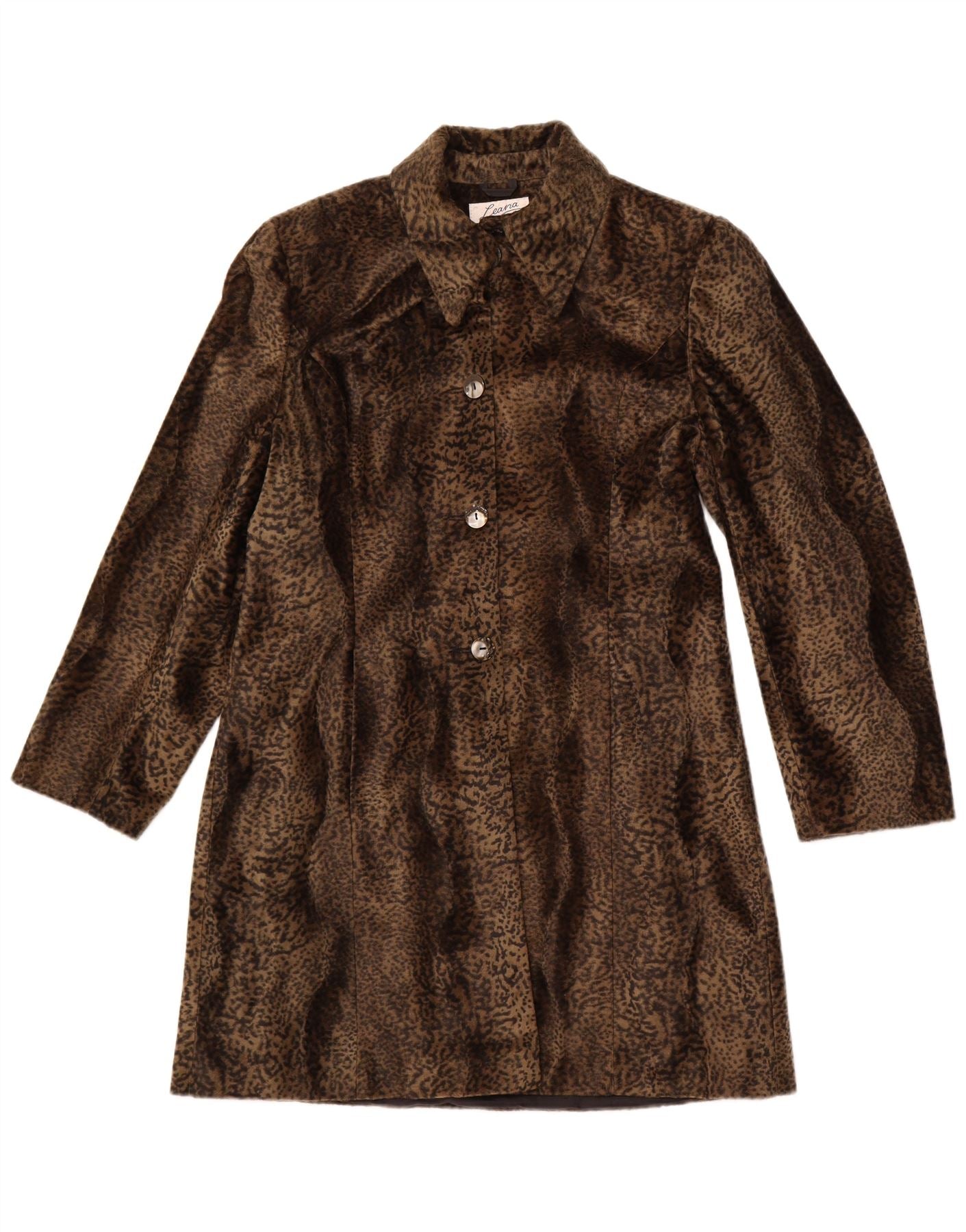 VINTAGE Womens Faux Fur Overcoat UK 14 Medium Brown Animal Print Polyester