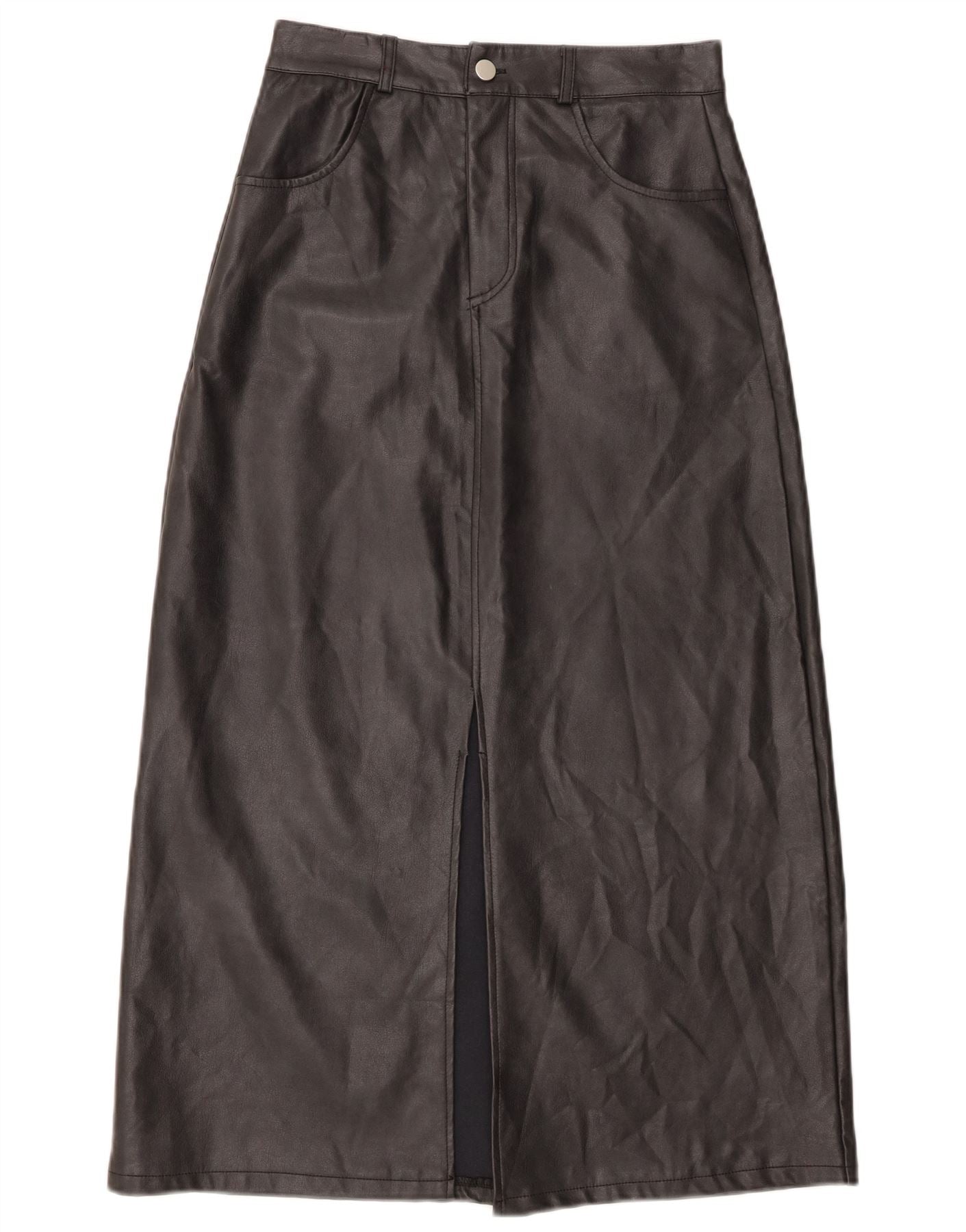 - AI Description: This Vintage womens faux leather maxi skirt is crafted from smooth black faux leather, offering a sleek, modern finish. It features a regular fit with a button closure and a subtle front split for ease of movement. Practical pockets are integrated into the design. The clean lines and contemporary style make it a versatile wardrobe addition, perfect for various occasions.